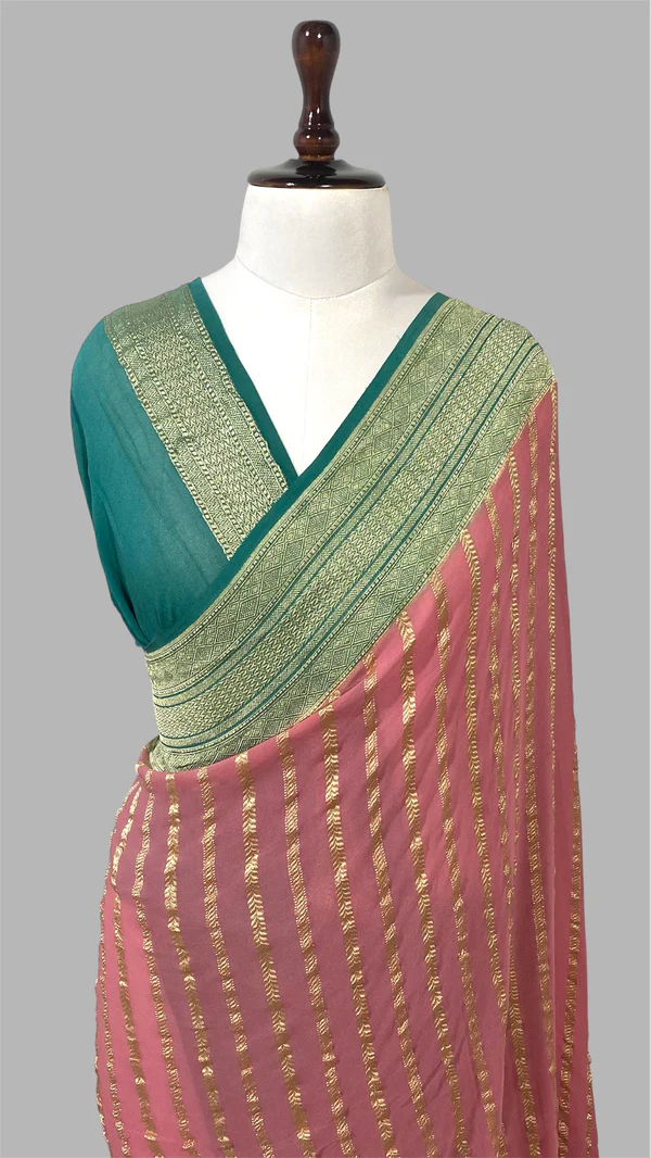 ‘GANGA JAMNA’ PURE KHADDI GEORGETTE HANDWOVEN KADHU BANARASI HALF AND HALF SAREE