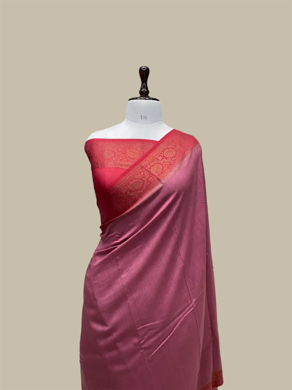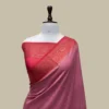 pure Banarasi saree made from Moonga silk has a distinct Austin majenta body with a tomato red border and pallu that represents traditional grace with a touch of modernity. Luxurious Moonga silk gives it a soft sheen and fluid drape while the woven patterns on the border and pallu are indicative of the artistic work that went into them. The ensemble is topped off with a blouse that is also tomato red as that of the borders and pallus, thus making it an all-round festive outfit for various occasions.
