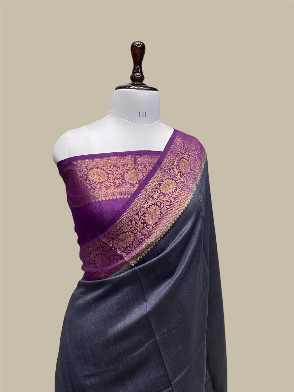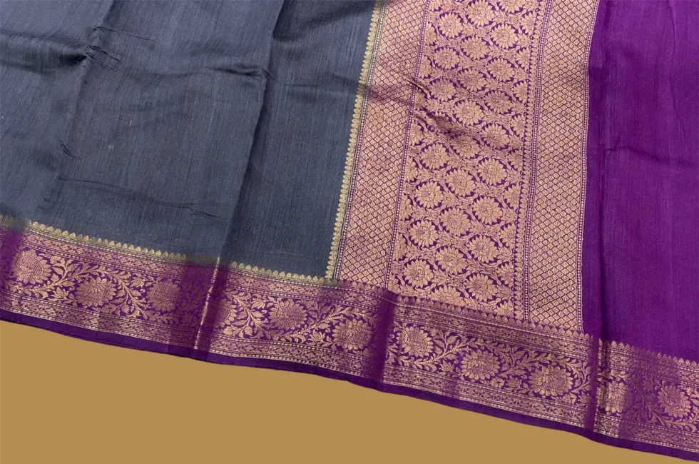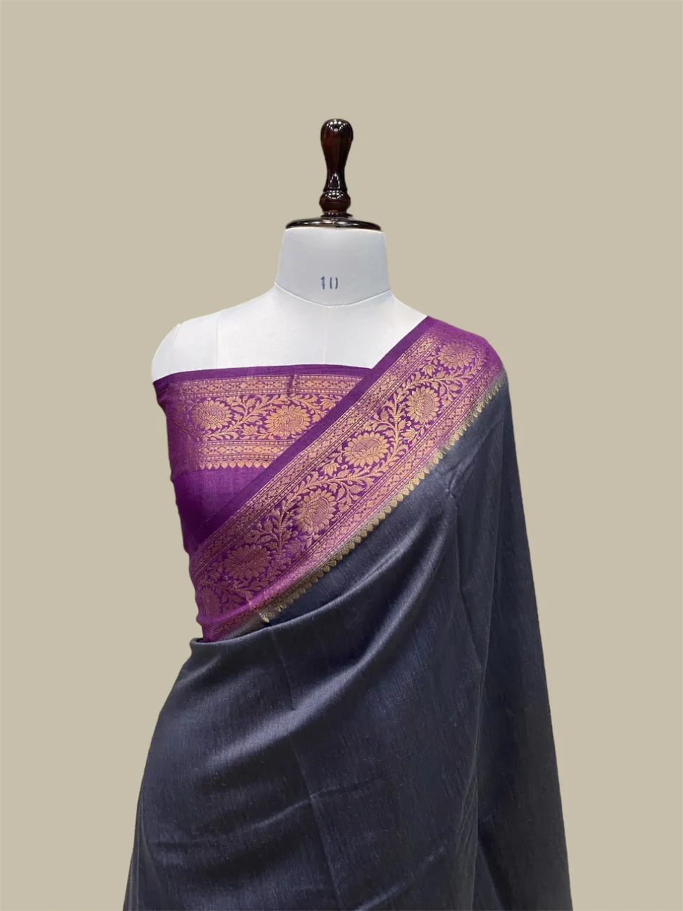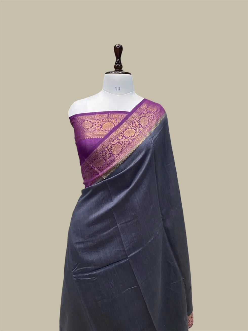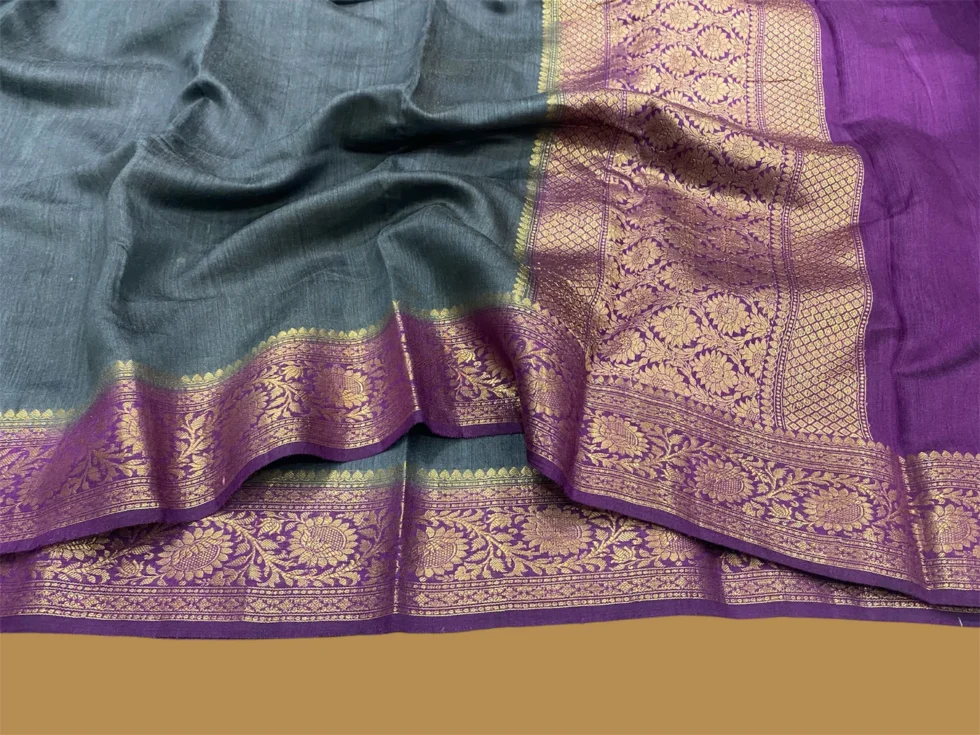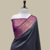 ‘DARK GRAY AND PURPLE’ PURE MOONGA SILK BANARASI BORDER PALLU SAREE