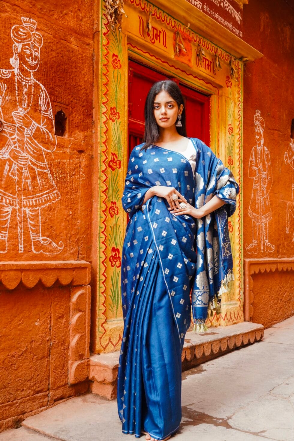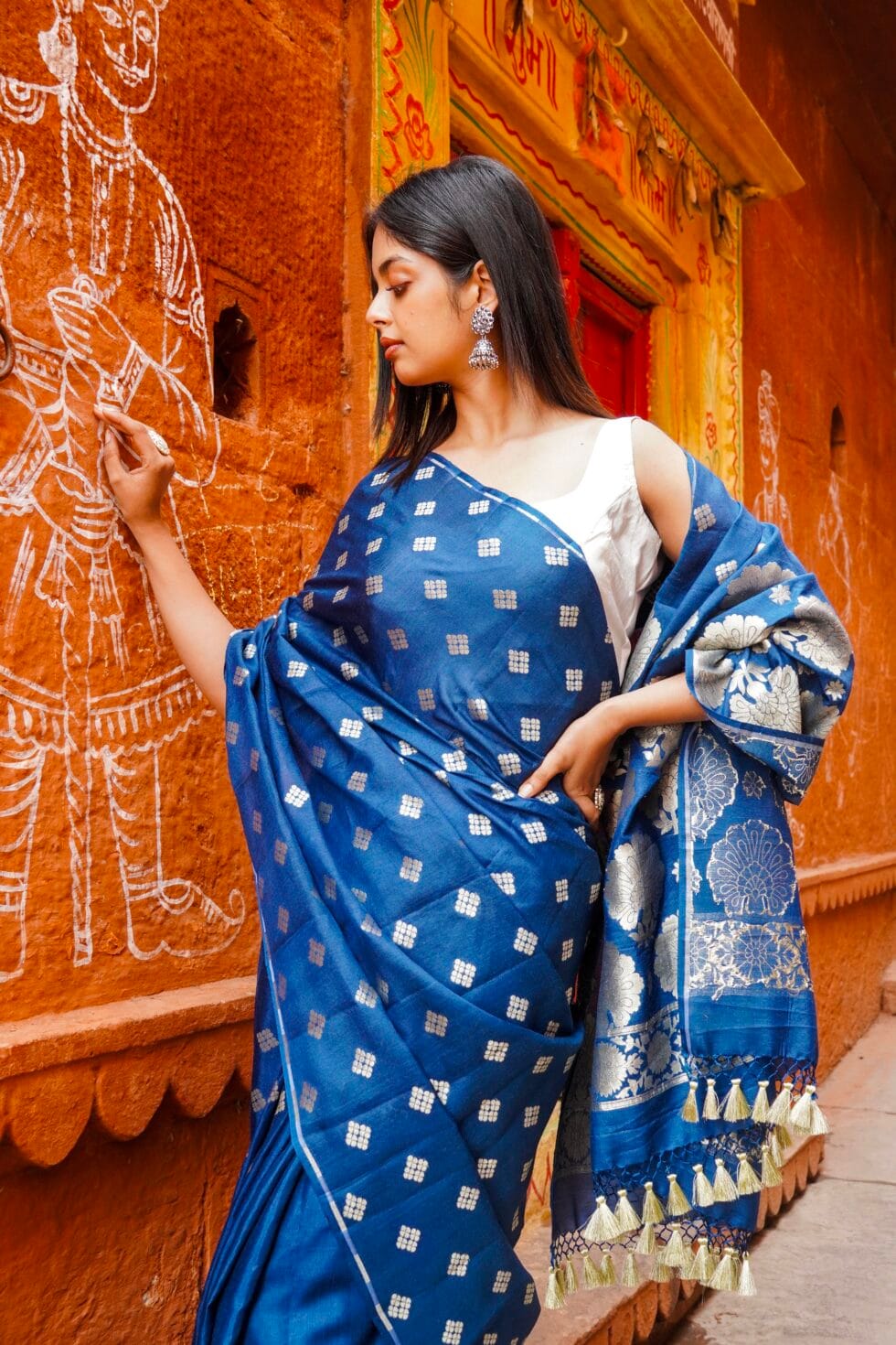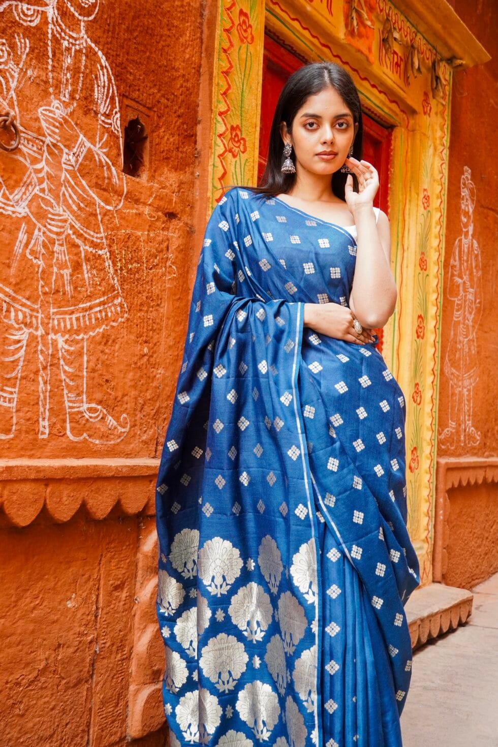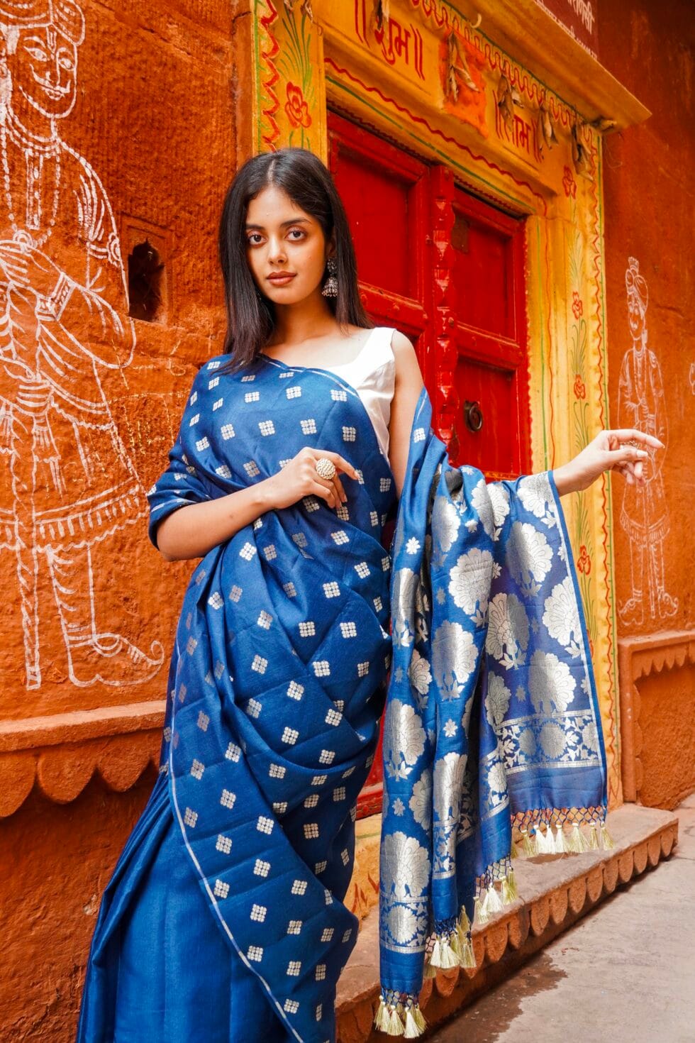 “GERMAN BLUE” HANDWOVEN MOONGA TUSSAR SILK BANARASI SAREE