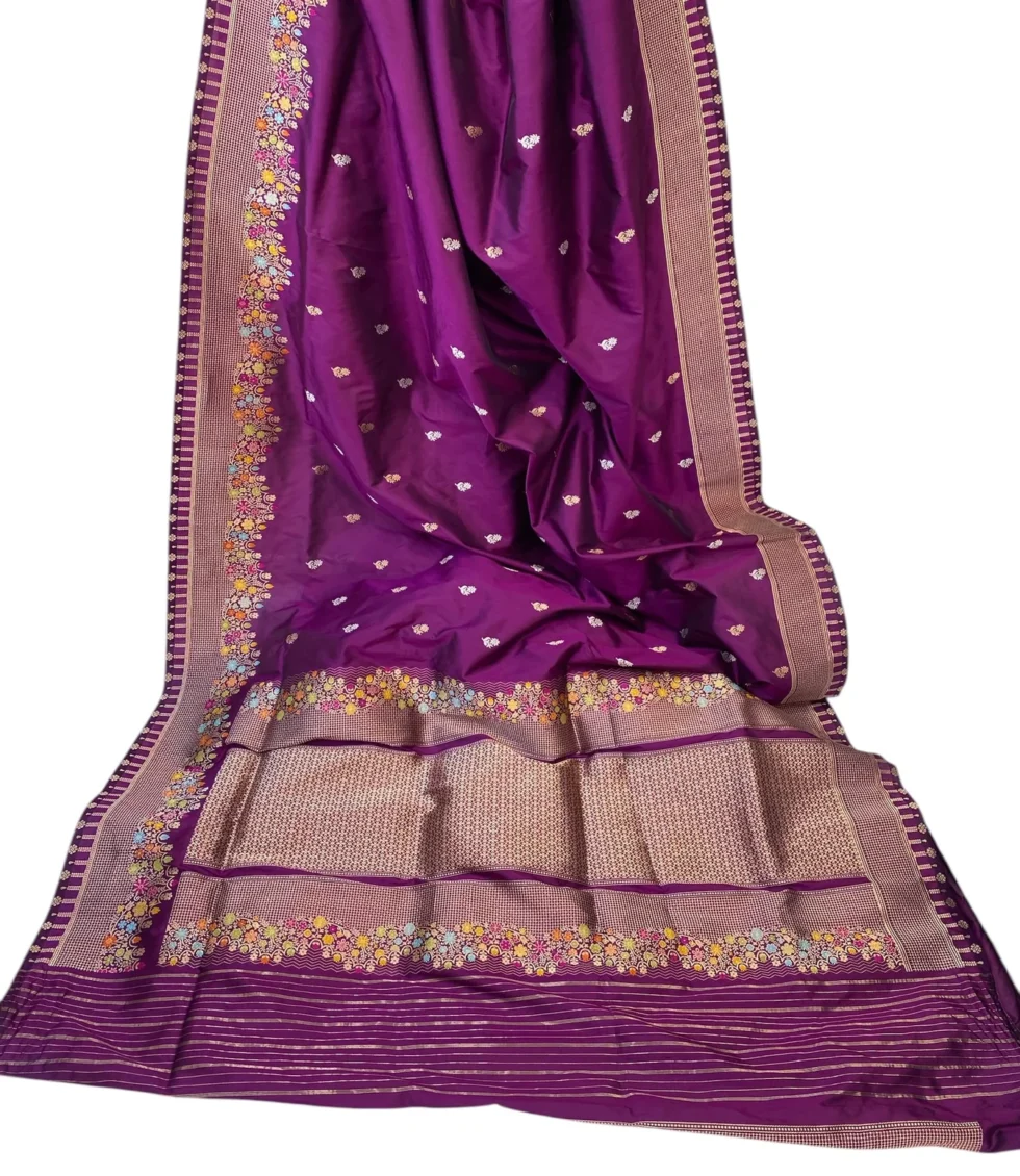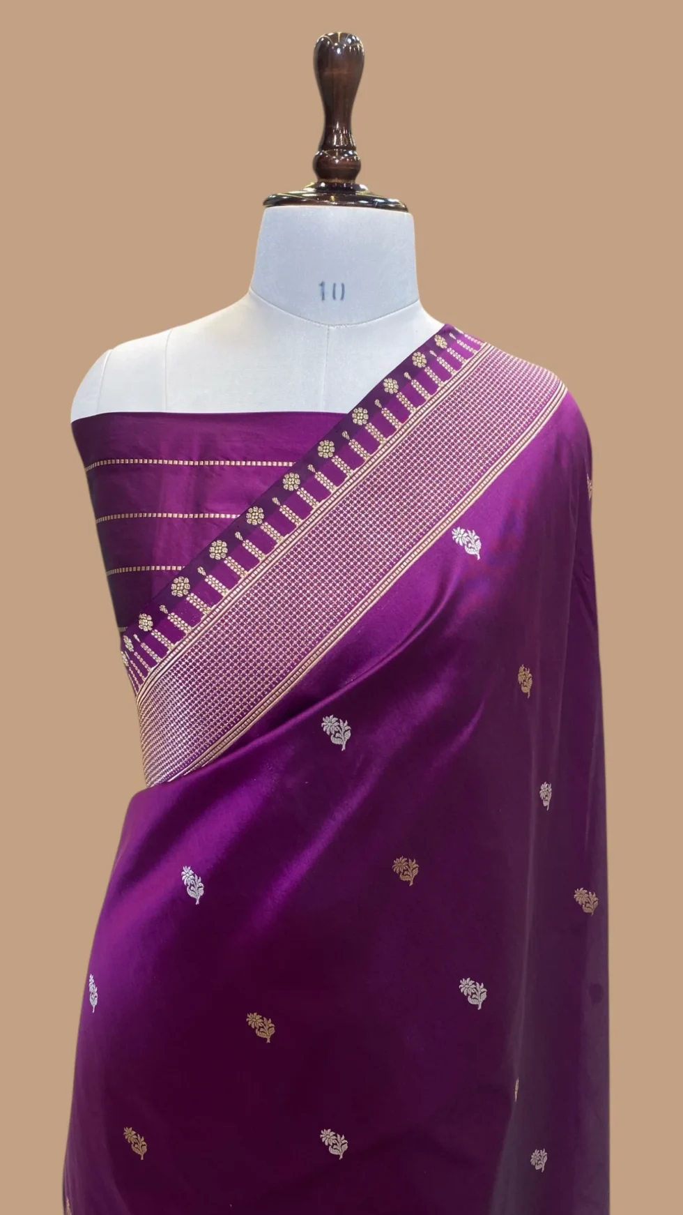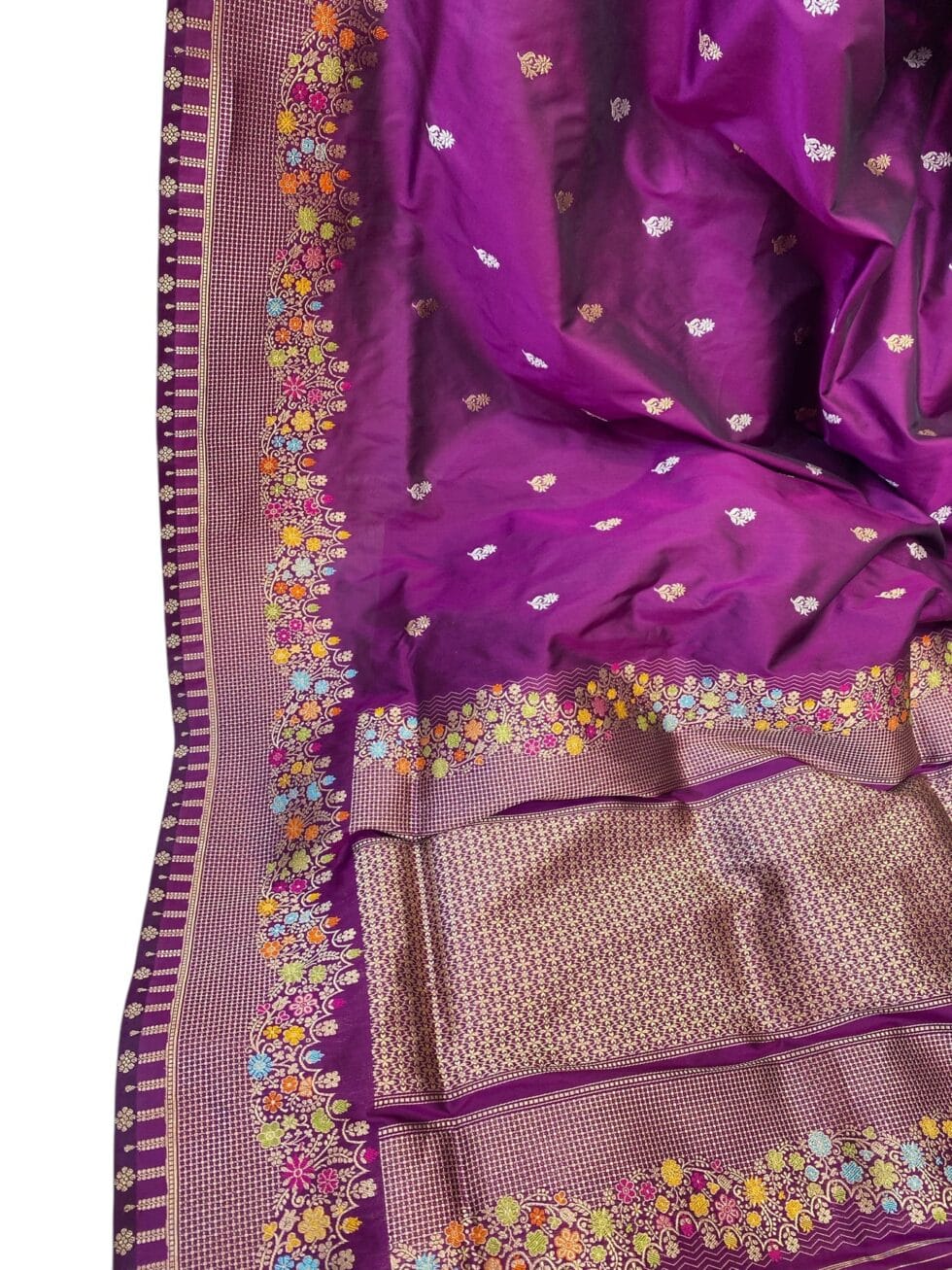 - Speciality – The glorious outline of kadua border lovingly handwoven on a base of resplendent silk in Sona or Gold zari kadua motifs. Incredible in its details and a mirror to the splendour of Banaras.