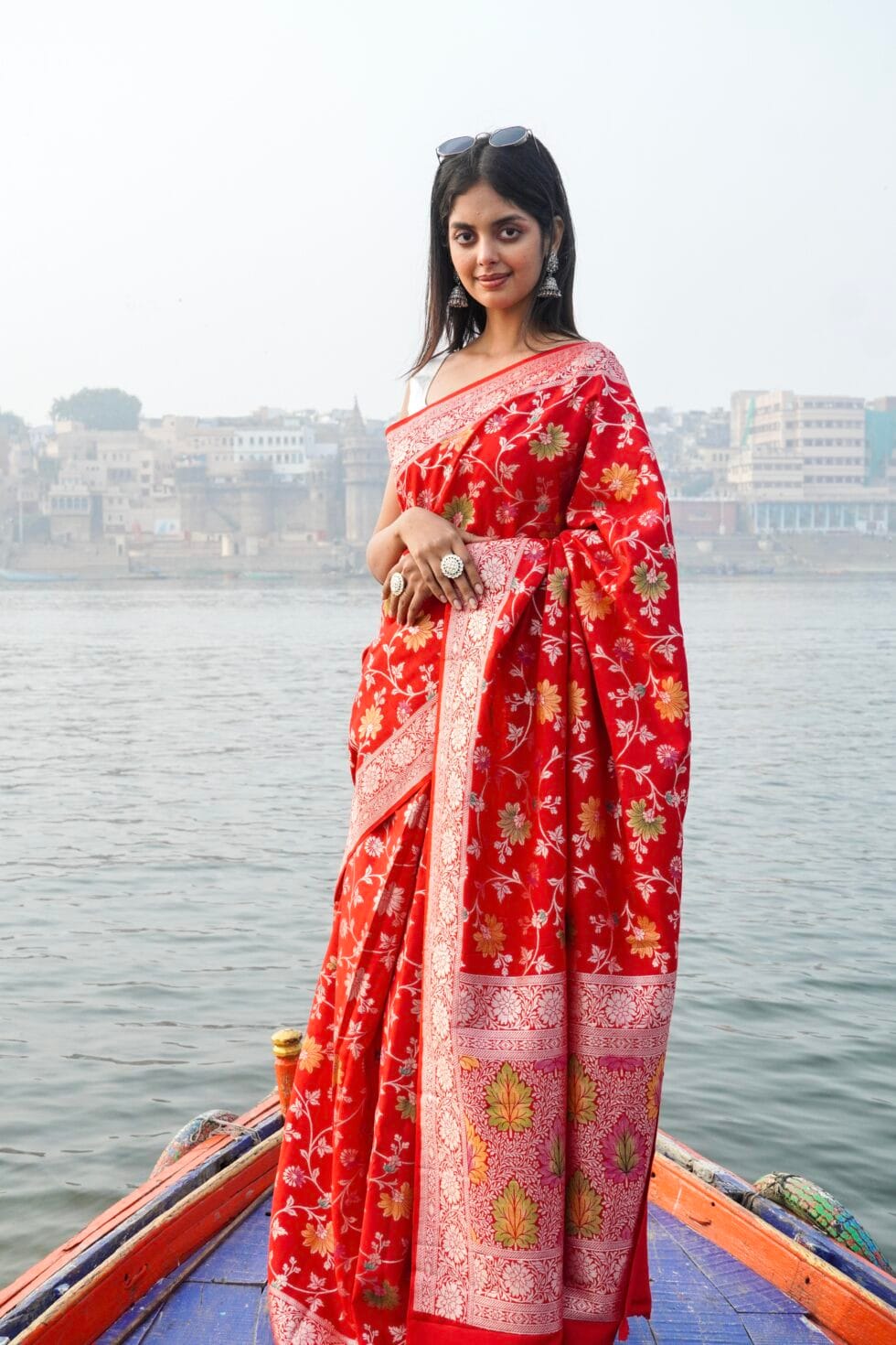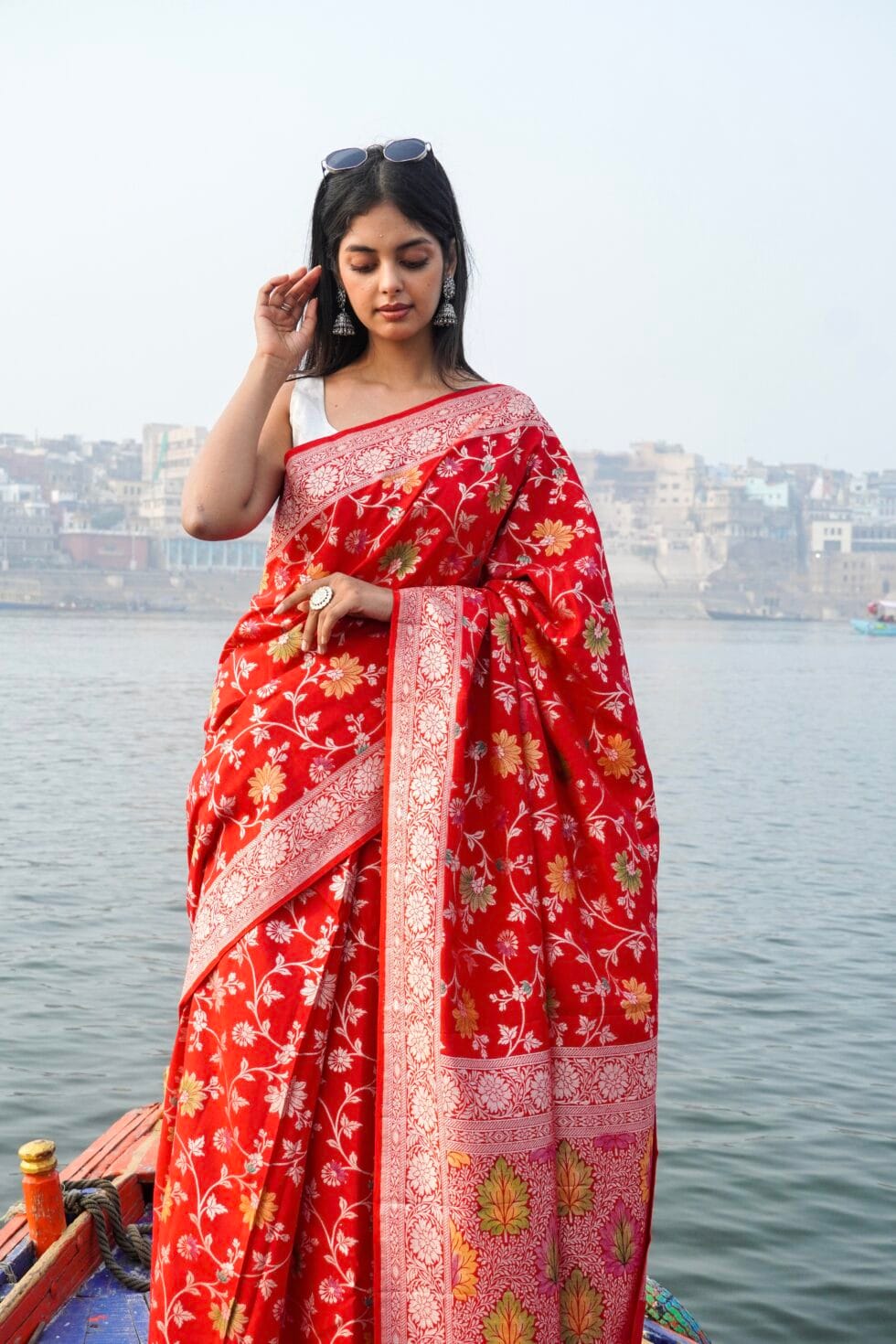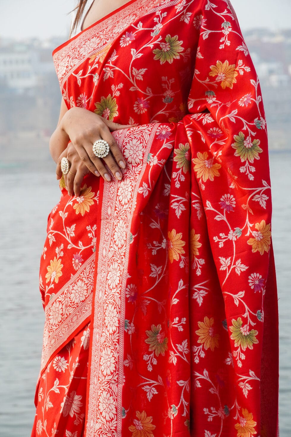 - Product : Pure Moonga silk Banarasi jangla bridal saree with the awesome chilly Red Color and many Color’s meenakari.