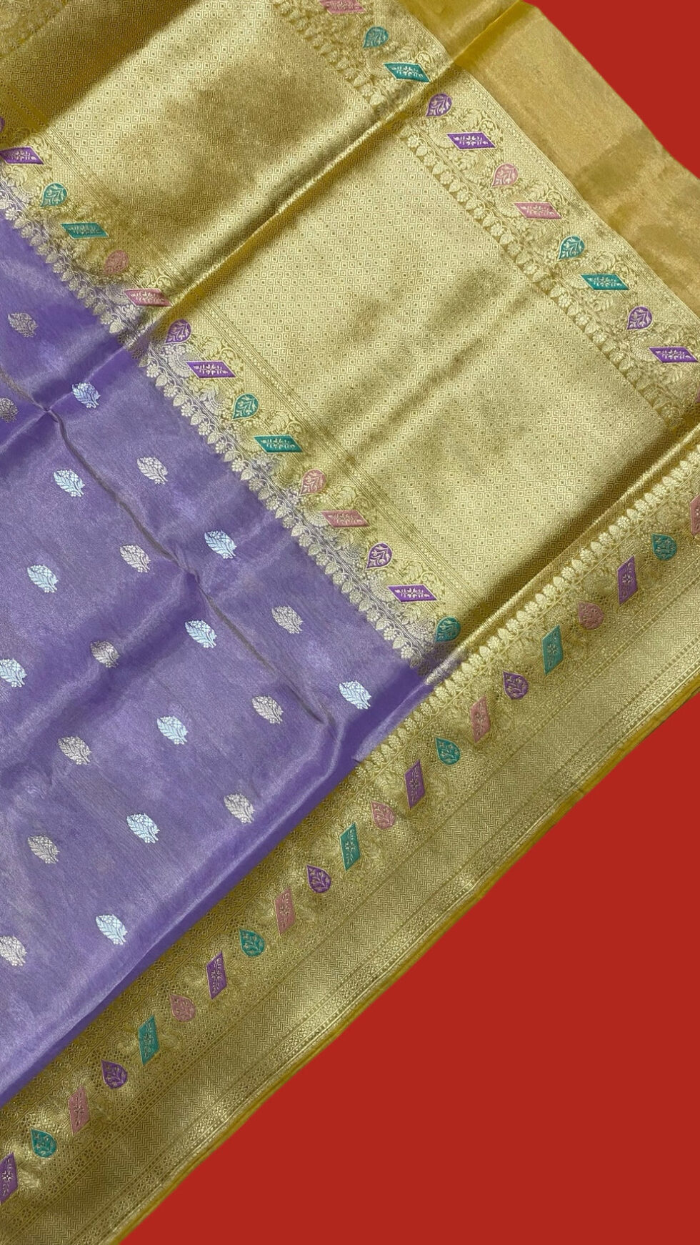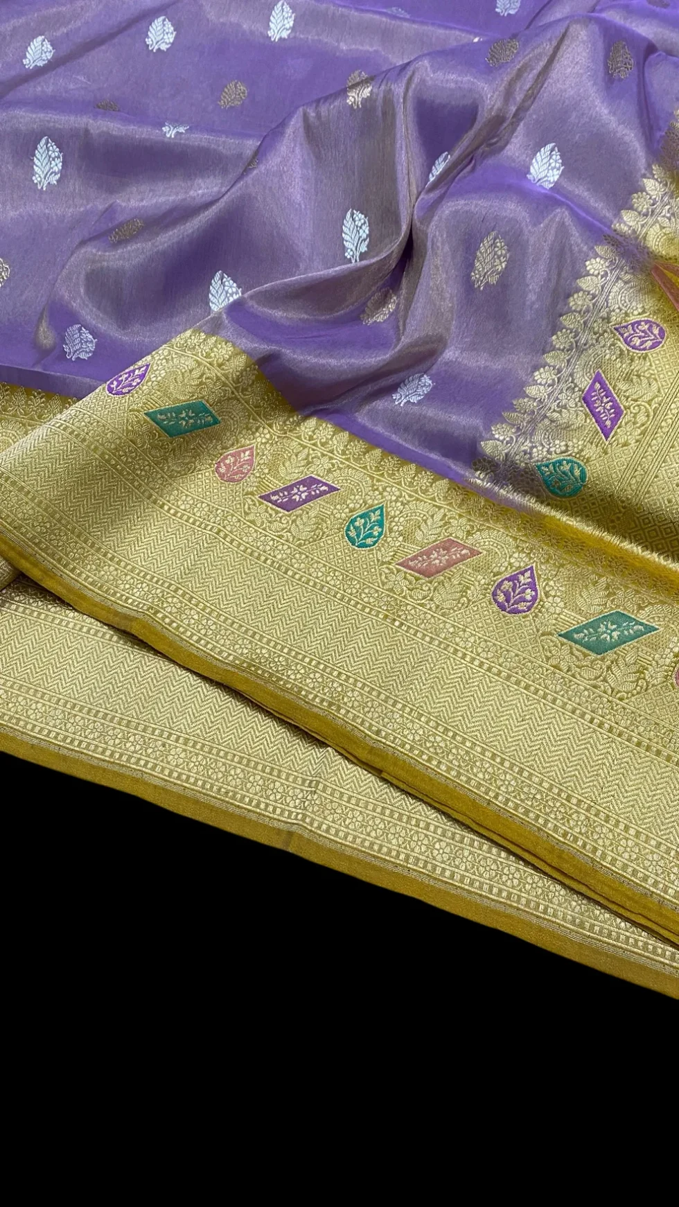 - A charming pure kataan tissue silk handwoven saree adorned with traditional kadhua zari buttas in body and scurt border with multiple colour meenaas weave by zari and multi colour reshams.