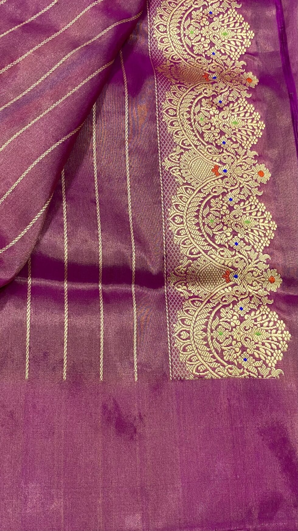 - A charming pure kataan tissue silk handwoven saree adorned with traditional kadhua silver gold zari buttas in body and border with meena weave by zari scalop by Banarsi Handloon.
