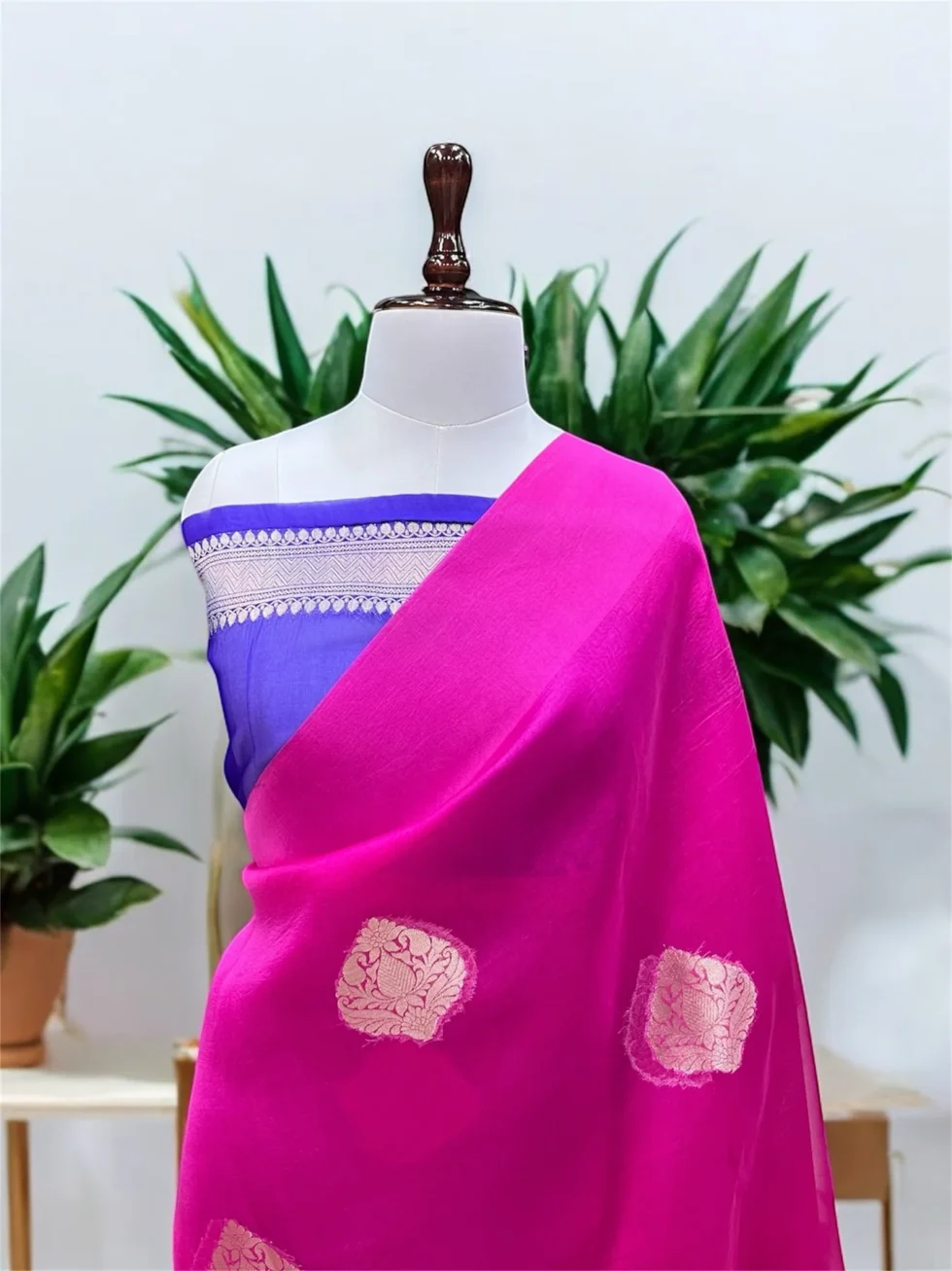 Pure organza sarees by Banarsi Handloon in Hot pink color. It has a beautiful mughal traditional style boota weaving in body with salvis zari (it is a mixture of gold,silver and almond zari)looks amazing saree. This charming organza saree in the daintiest of hues and beguiling zari work is apt for all celebrations. The Saree looks stunning and captivating on the drape.