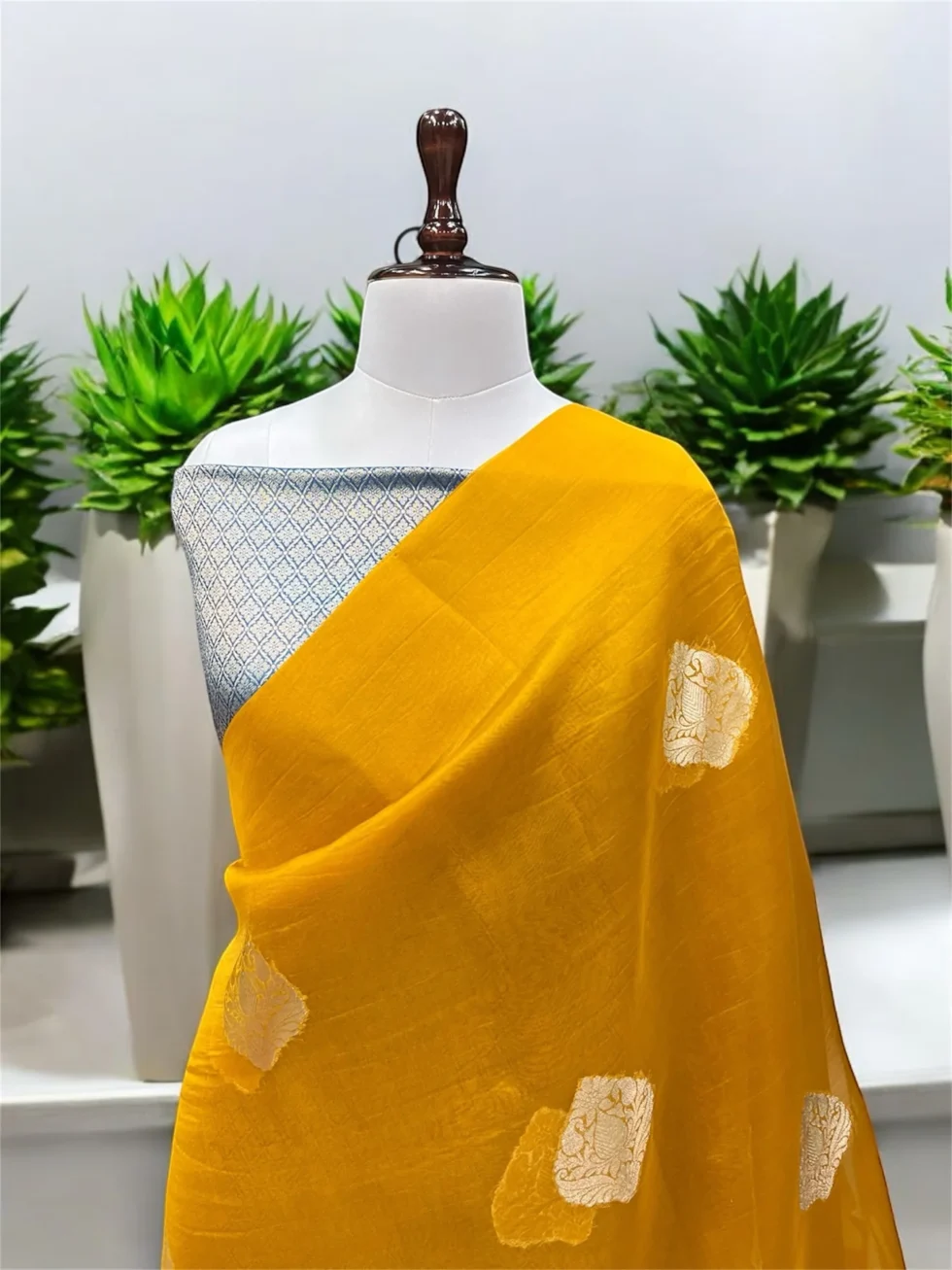 Pure organza sarees by Banarasi Handlooms in mustard color. It has a beautiful mughal traditional style boota weaving in body with salvis zari (it is a mixture of gold,silver and almond zari)looks amazing saree. This charming organza saree in the daintiest of hues and beguiling zari work is apt for all celebrations. The Saree looks stunning and captivating on the drape.