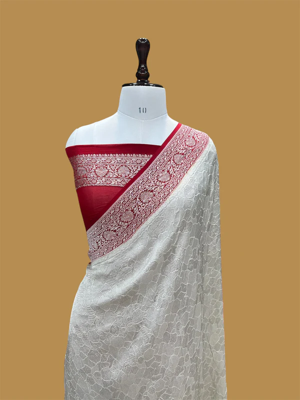 ‘OFF WHITE RED’ PURE KHADDI CHIFFON BANARASI HANDLOON SAREE