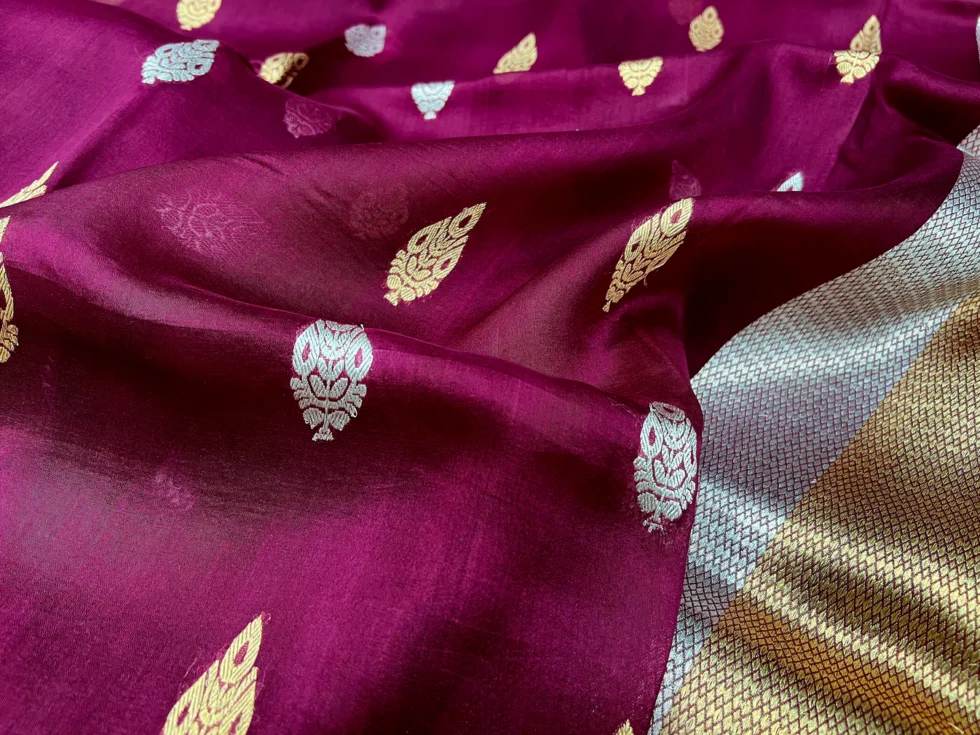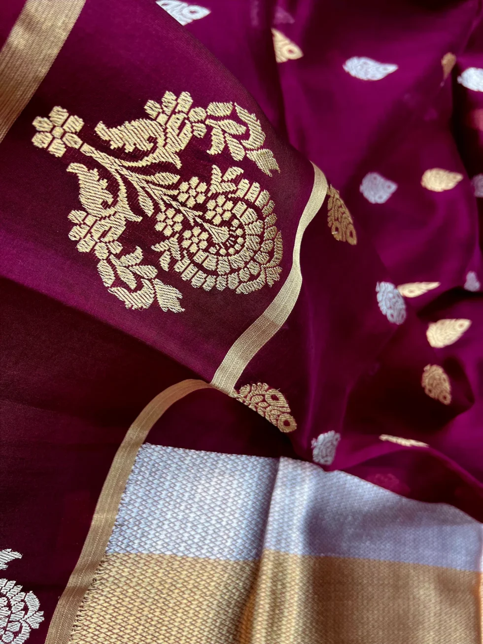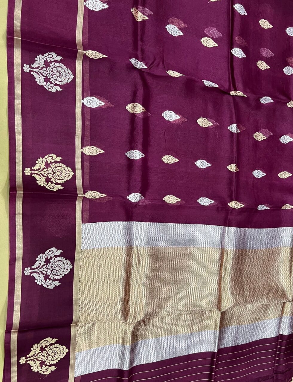 Pure organza sarees by Banarsi Handloon in vine color. It has a beautiful satin patta with gold zari butta weaved in border and floral silver gold zari booti all over. This charming handwoven organza saree in the daintiest of hues and beguiling zari work is apt for all celebrations. The Saree looks stunning and captivating on the drape.