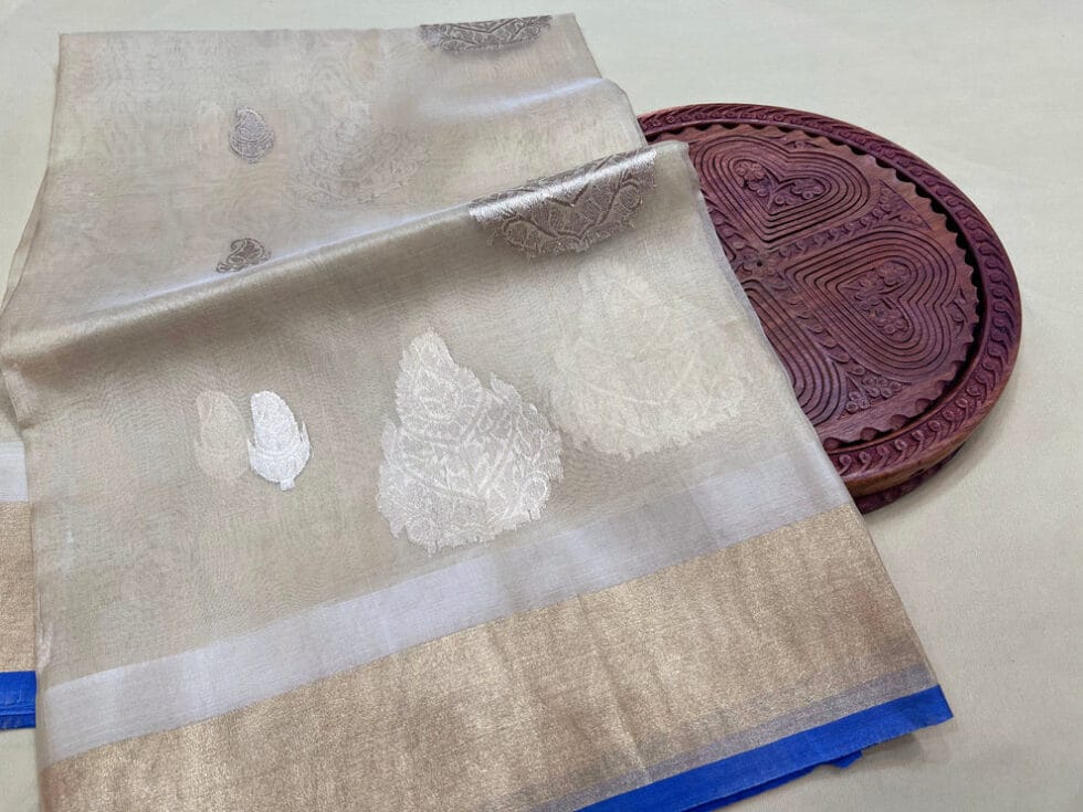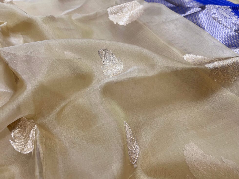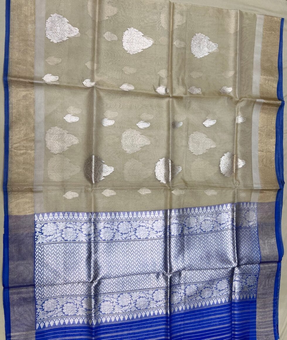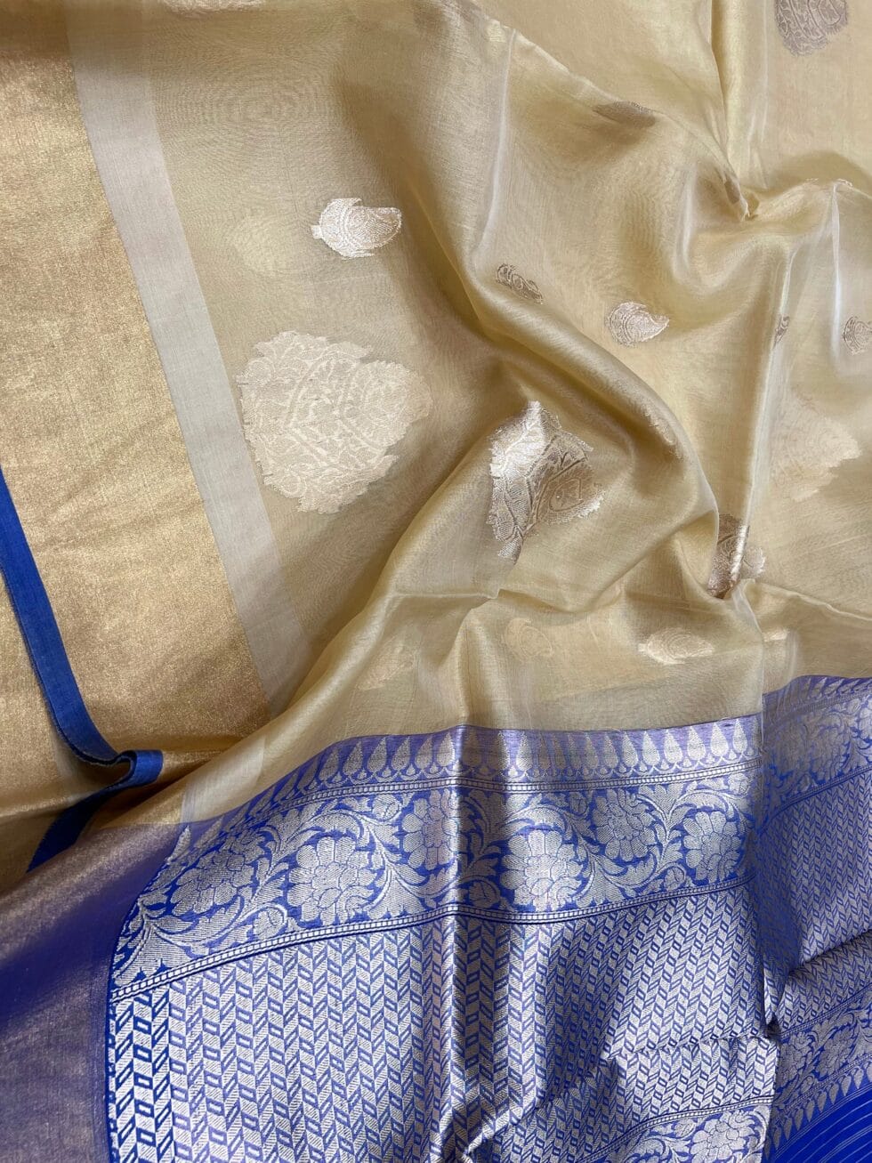 Pure organza sarees by Banarsi Handloon in Beige/blue color. It has a beautiful zari patta with gold zari border and floral gold zari booti all over. This charming handwoven organza saree in the daintiest of hues and beguiling zari work is apt for all celebrations. The Saree looks stunning and captivating on the drape.