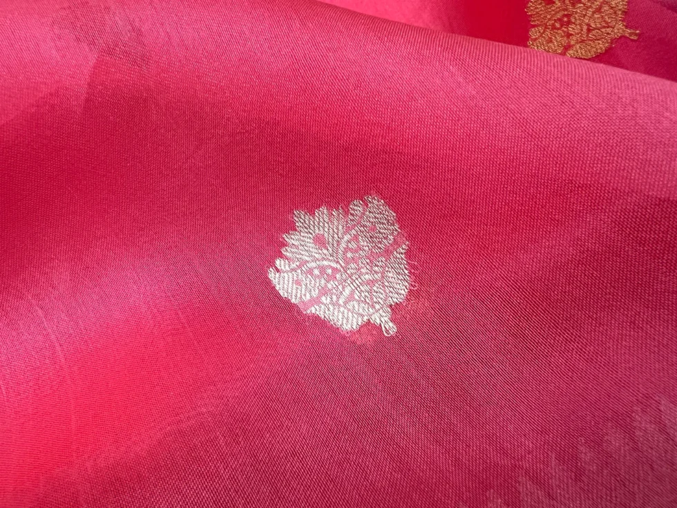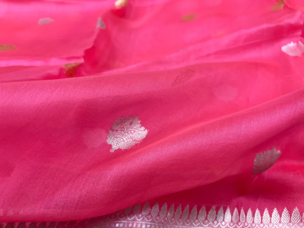 Pure organza sarees by Banarsi Handloom in Strawberry pink color. It has a beautiful gold zari border and floral silver gold zari booti all over. This charming handwoven organza saree in the daintiest of hues and beguiling zari work is apt for all celebrations. The Saree looks stunning and captivating on the drape.