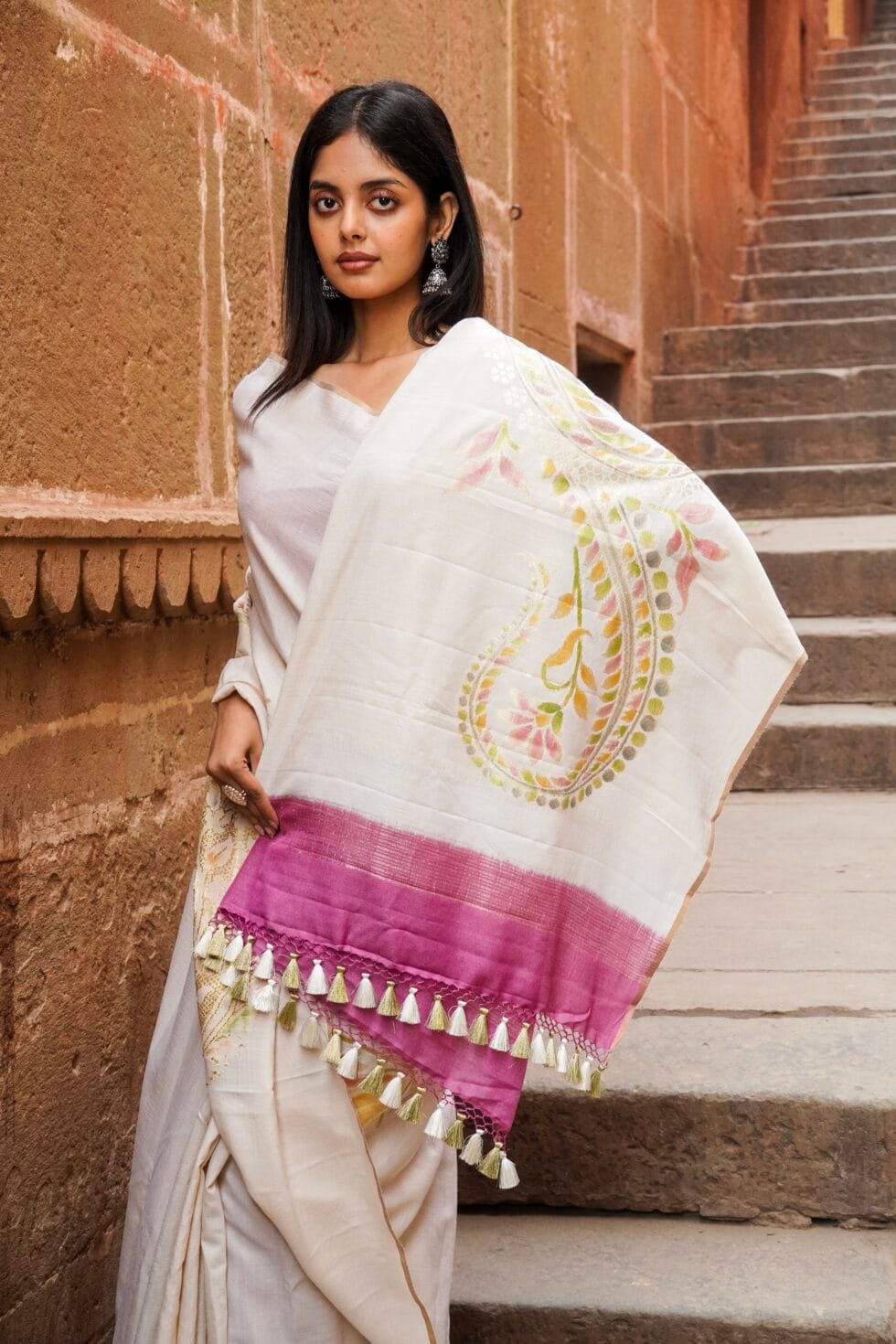 - Fabric – Light to carry and flattering to drape, pure Moonga Silk.