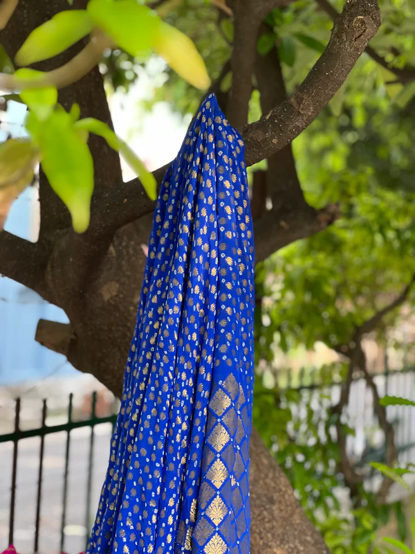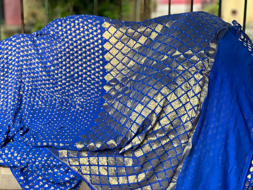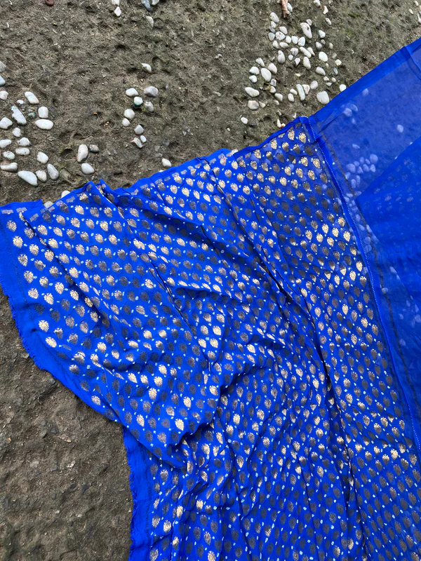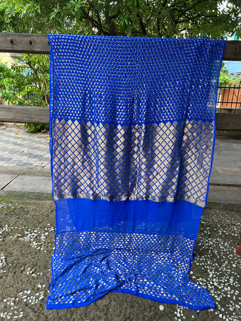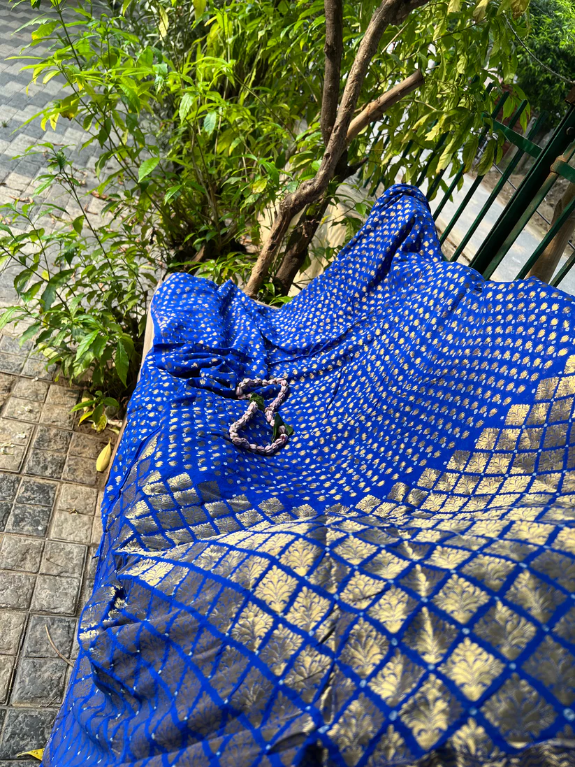 A dream in Banarasi khaddi chiffon. Beautifully textured bandhani in Royal blue. Saree is adorned with gorgeous gold zari jaal booti blended with tie and die technique. An age-old art from Rajasthan and Gujrat. Mesmerizing floral gold zari border and pallu look stunning and captivating on drape. An artistic match made in Banaras.this is half and half saree.half saree weave from gold zari booti and half saree weave from antique zari jaal.