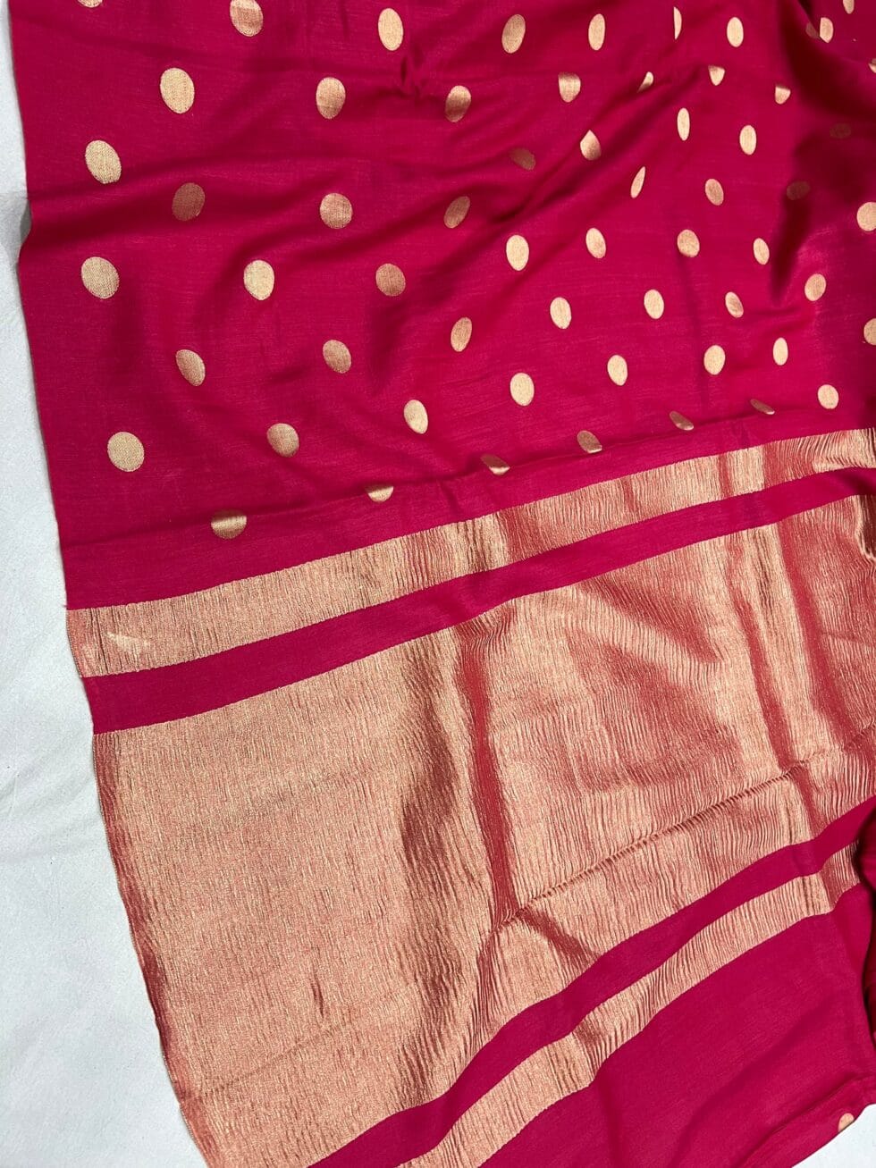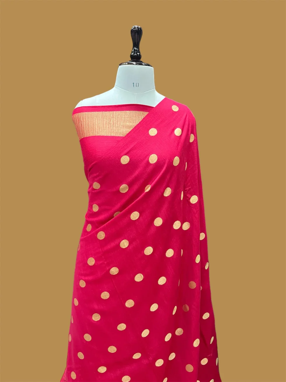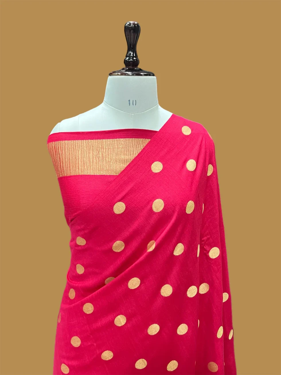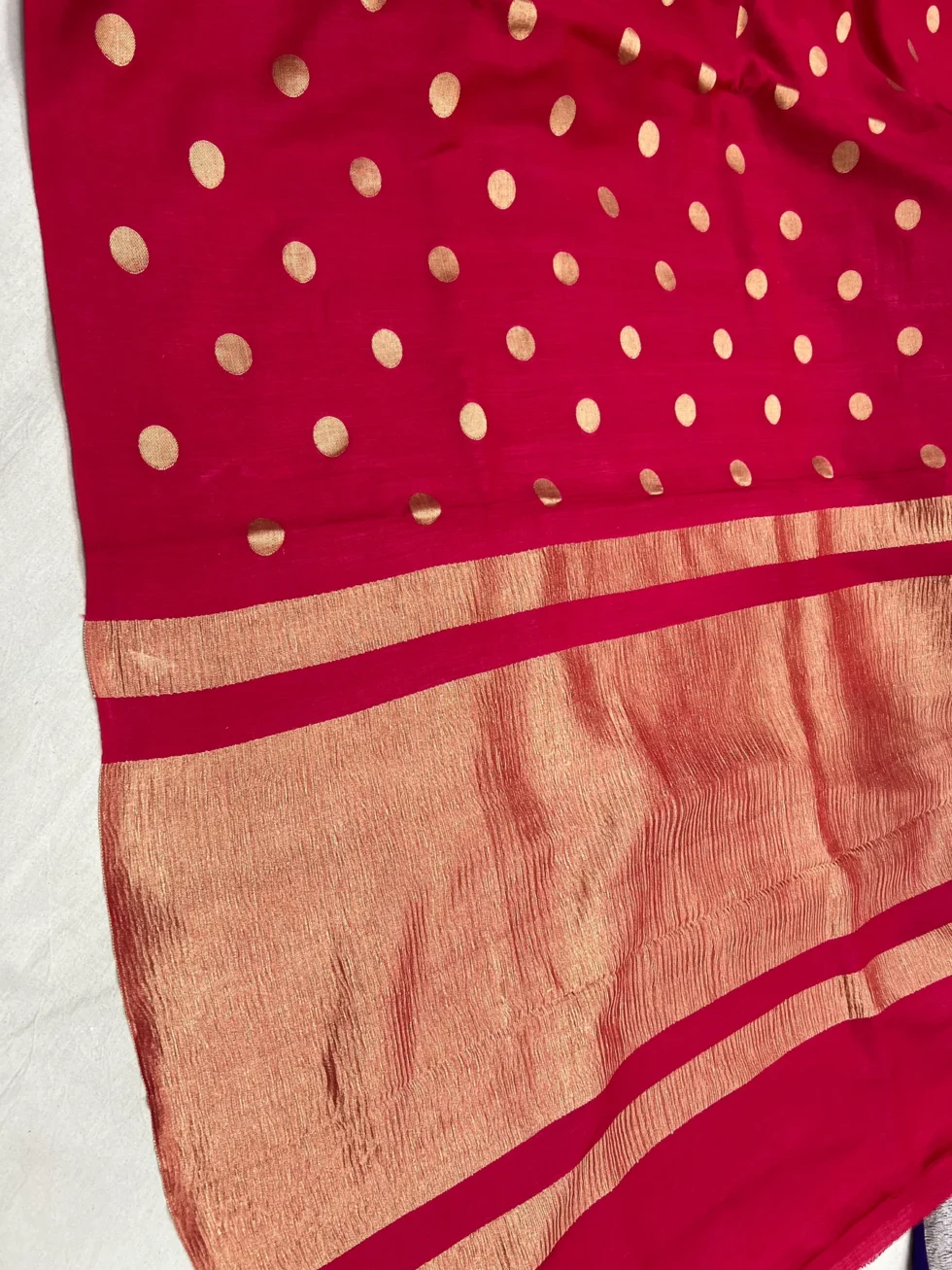 Pure moonga silk sarees by Banarasi Handloomin Red color. It has a beautiful Reshmi gold zari asharfi booti in body all over. This charming moonga saree in the daintiest of hues and beguiling zari work is apt for all celebrations. The Saree looks stunning and captivating on the drape. The fabric has a soft feel.