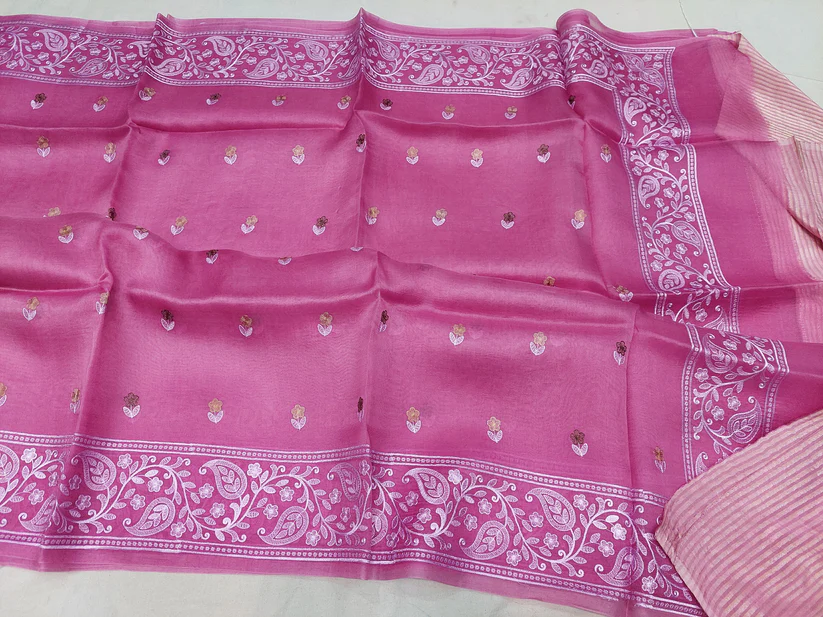 Pure organza silk with Kashmiri chikankari,blouse fabric is pure Moonga silk.