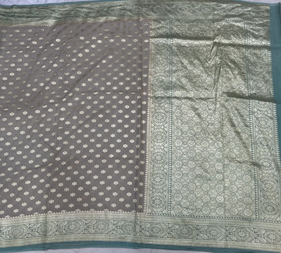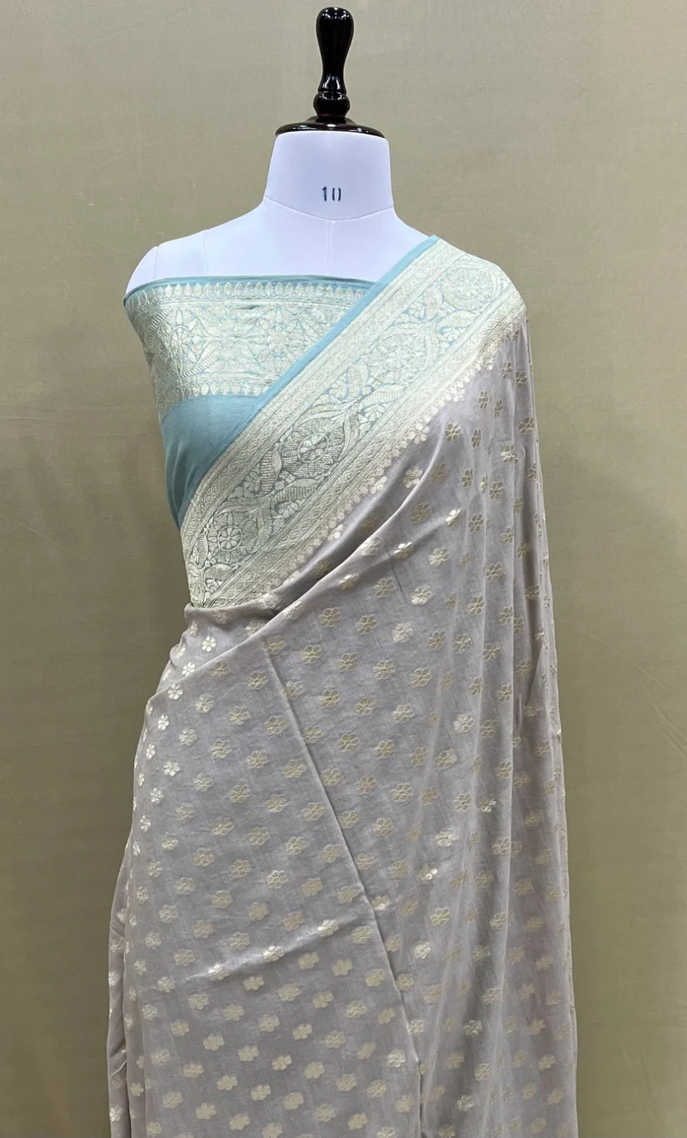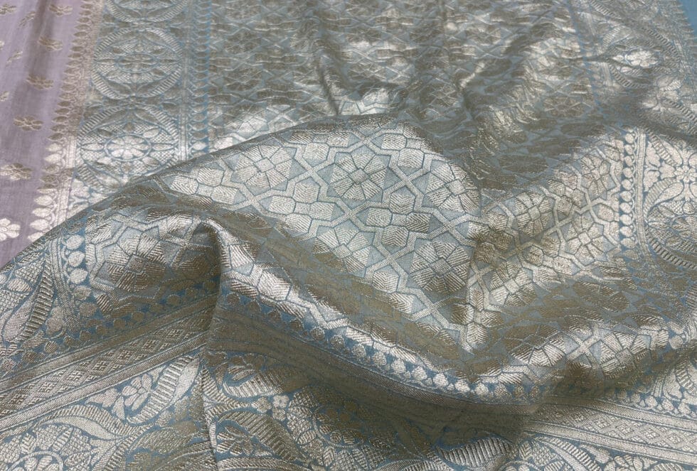 • Speciality – Elegant silver zari woven in the exquisite kadwa weave, on a dainty palette. Enduring art from Banaras!