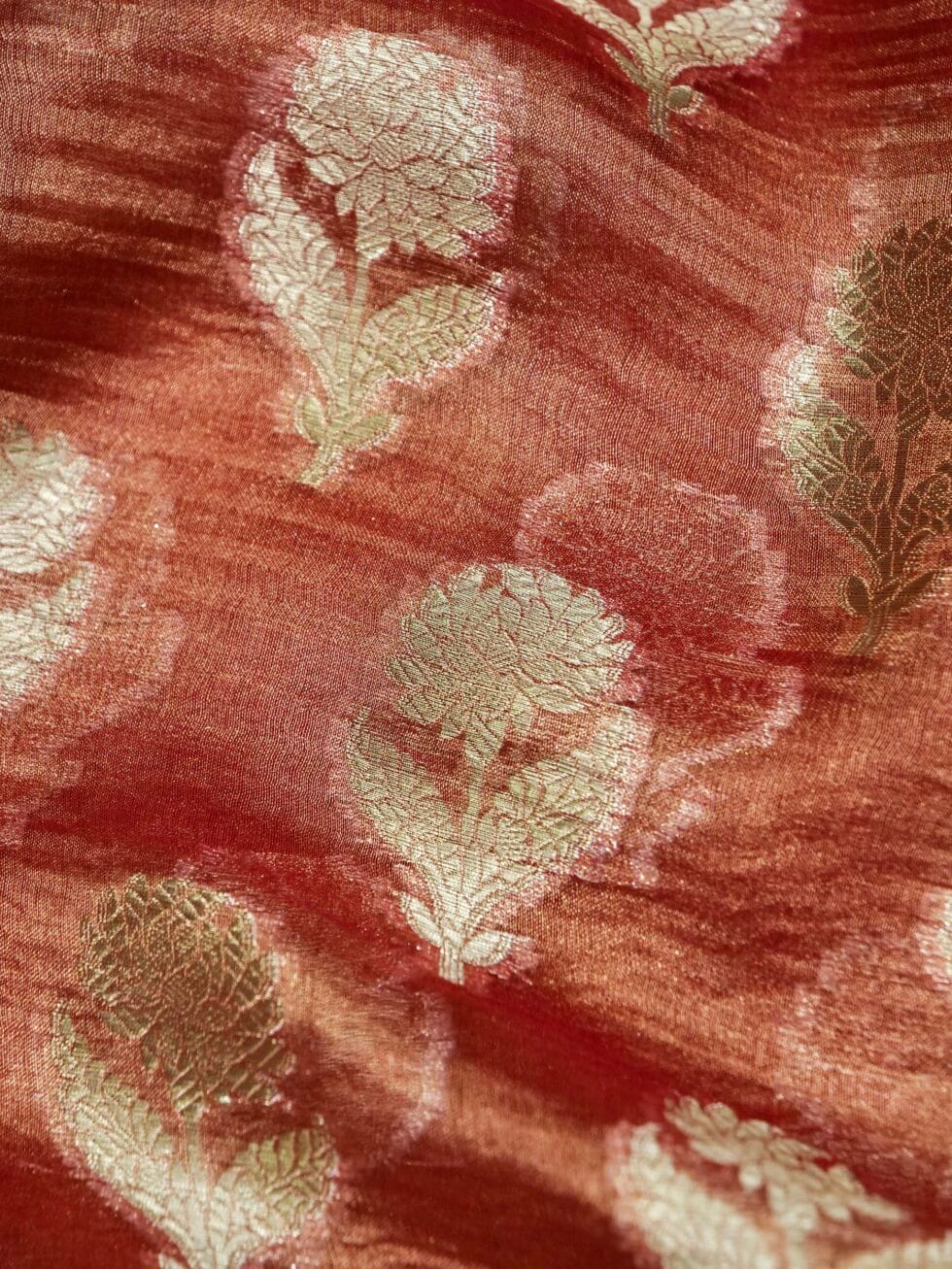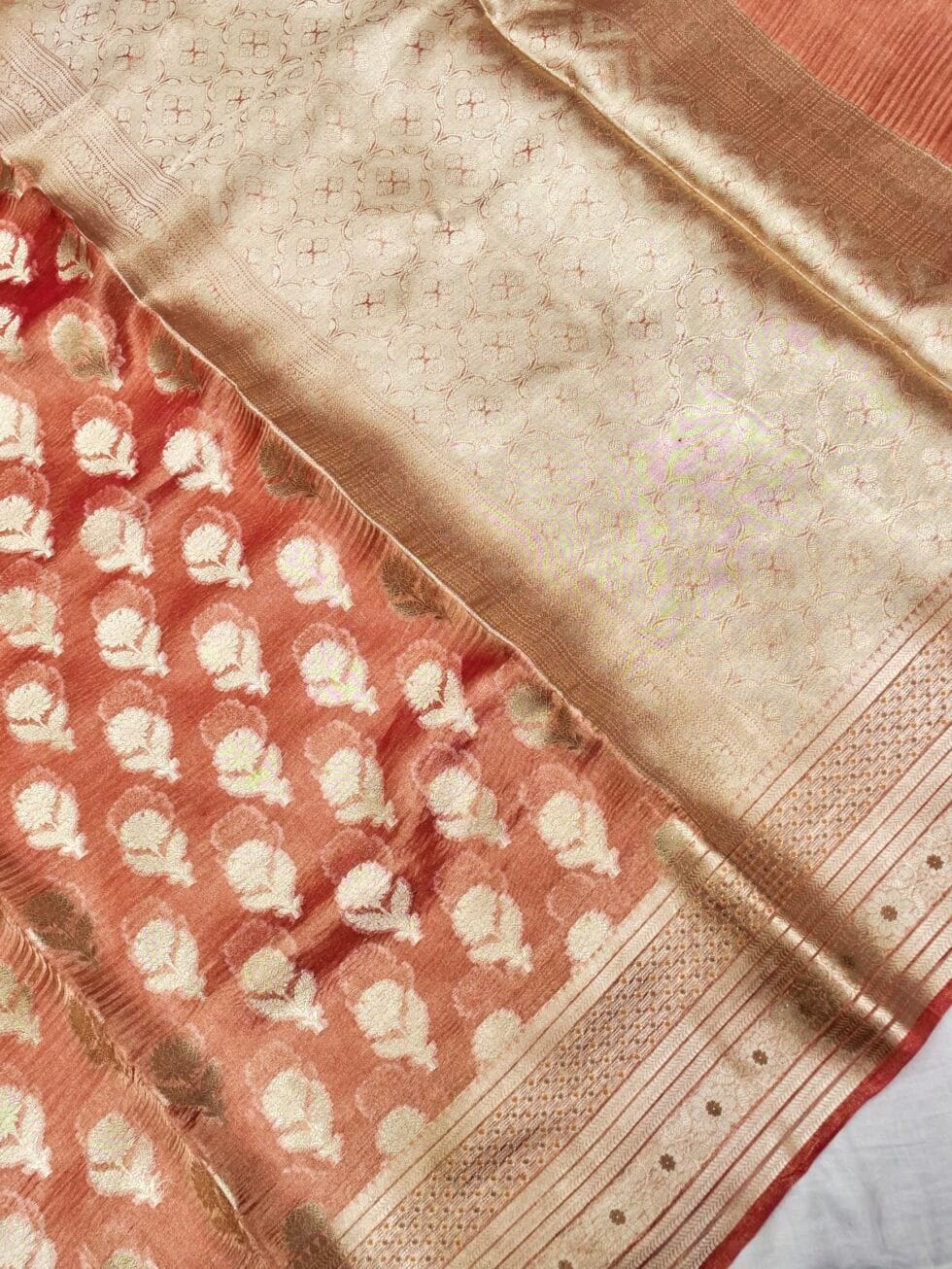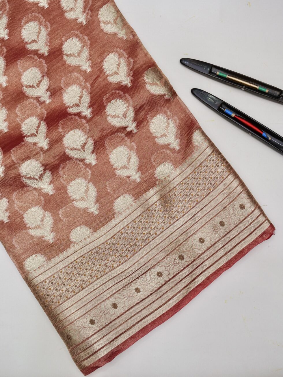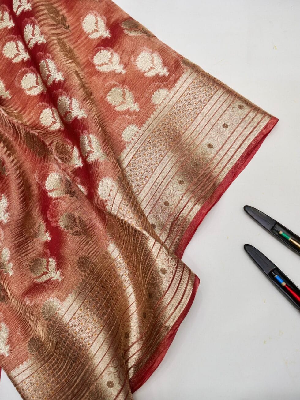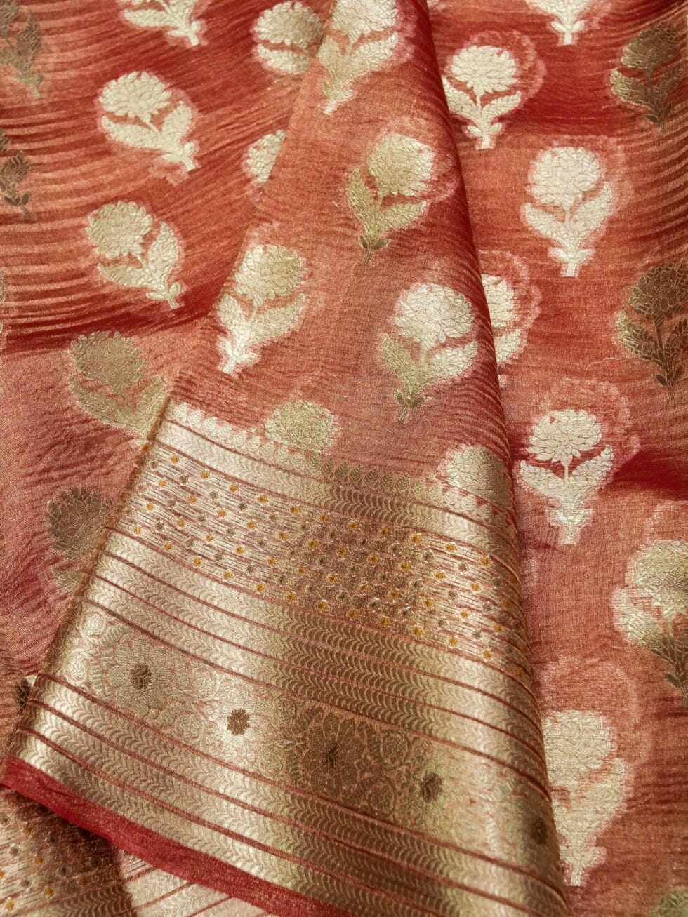 A Banarasi kora tissue saree is a luxurious traditional Indian garment known for its lightweight and sheer fabric made from silk. It features intricate zari work, often with gold and silver threads, creating elegant patterns and a rich texture. This saree is celebrated for its sophistication and is typically worn on special occasions and weddings.