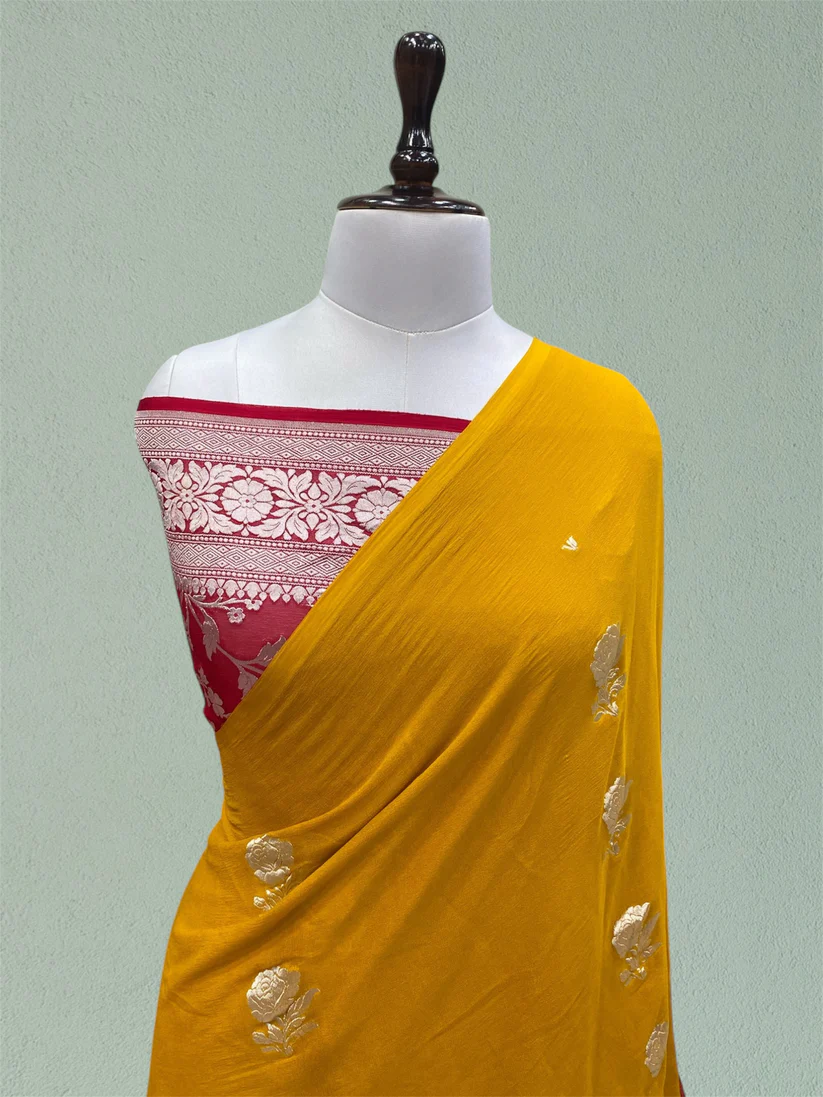 This is pure khaddi georgette handloom Banarasi saree in Mustard gold colour by Tanchhuii.it has a rose flower like buttas in body and red colour blouse with silver zari jaal weaved.and it contains very beautiful jaal weaved aanchal pallu.this is very unique and stylish borderless saree.