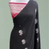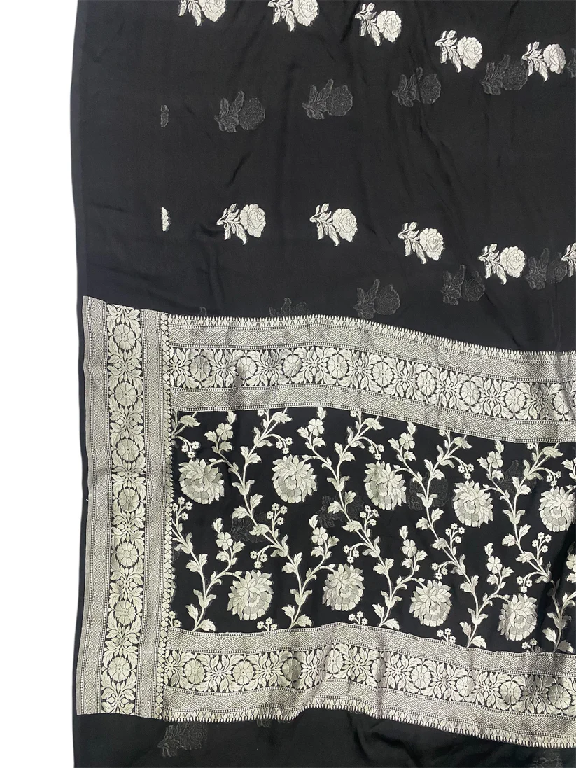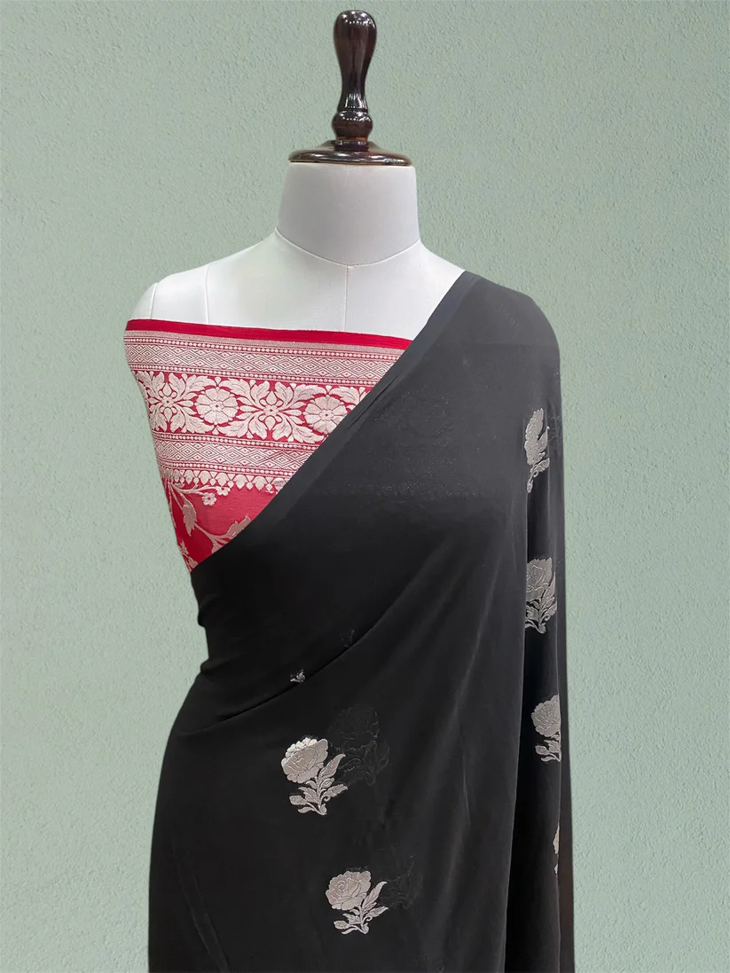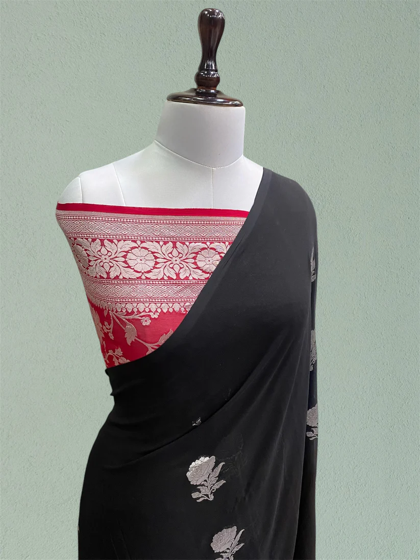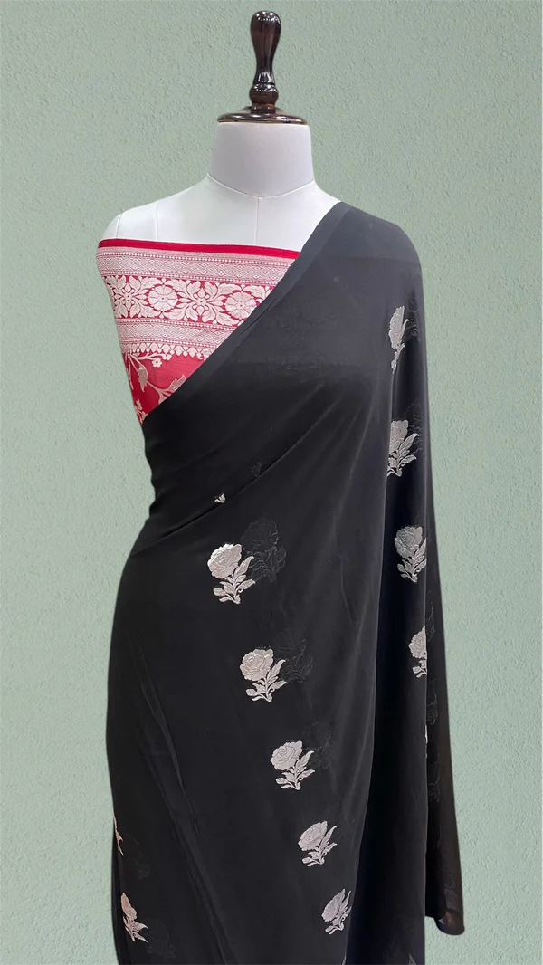This is pure khaddi georgette handloom Banarasi saree in z black colour by Tanchhuii.it has a rose flower like buttas in body and red colour blouse with silver zari jaal weaved.and it contains very beautiful jaal weaved aanchal pallu.this is very unique and stylish borderless saree.
