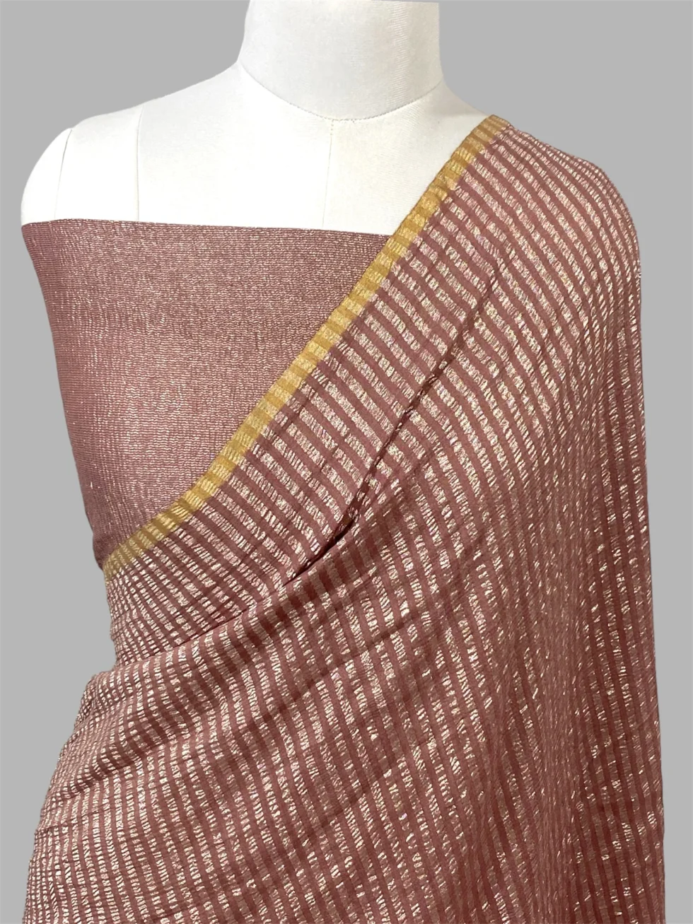 Pure moonga silk handloom Banarasi silver zari strip saree in steel peach colour by Banarasi Handloom.it contains silver zari patti blouse piece.