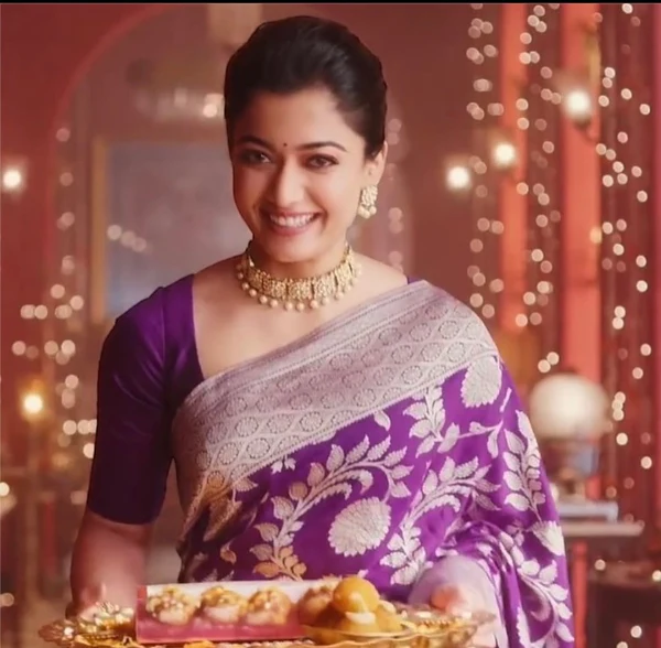 This is pure khaddi georgette handloom Banarasi saree in purple colour by Tanchhuii.this saree is wear by the Bollywood and Tollywood industry heroine Rashmika mandana saree design is between boota and jaal weaved with the Almond zari.