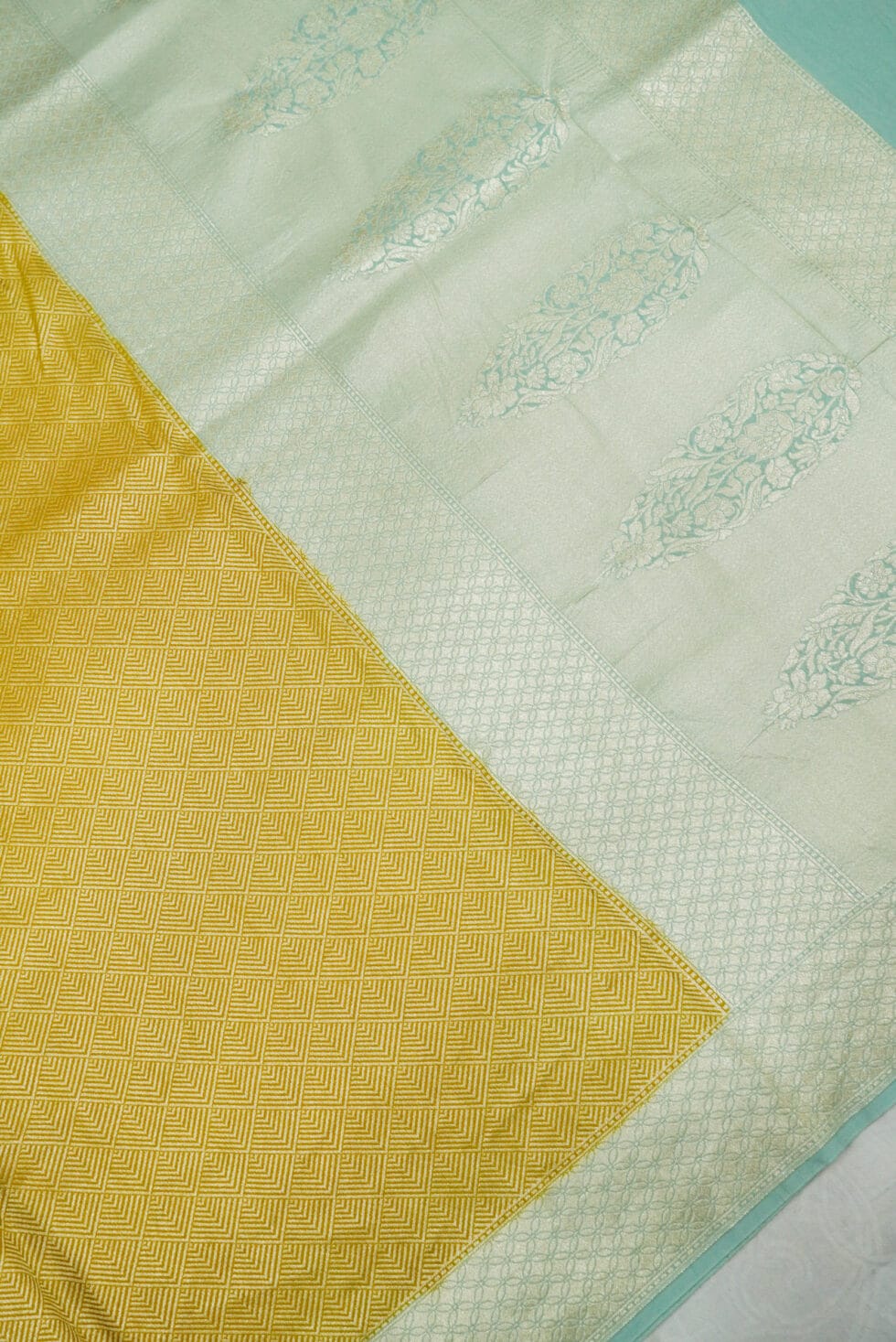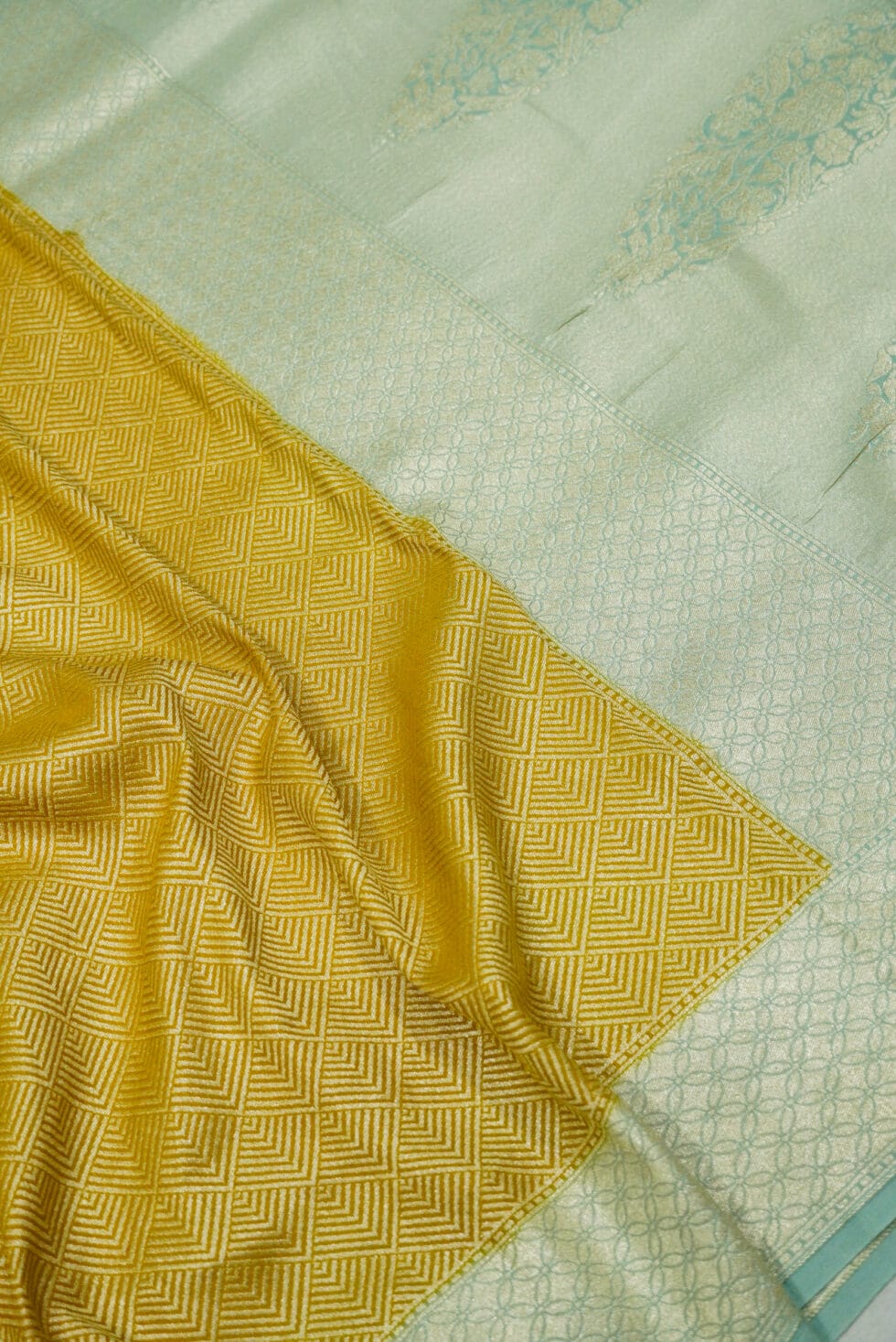 Pure Munga silk Banarasi Handloom in dual tone body armour Gold Color and border Aanchal baby blue.